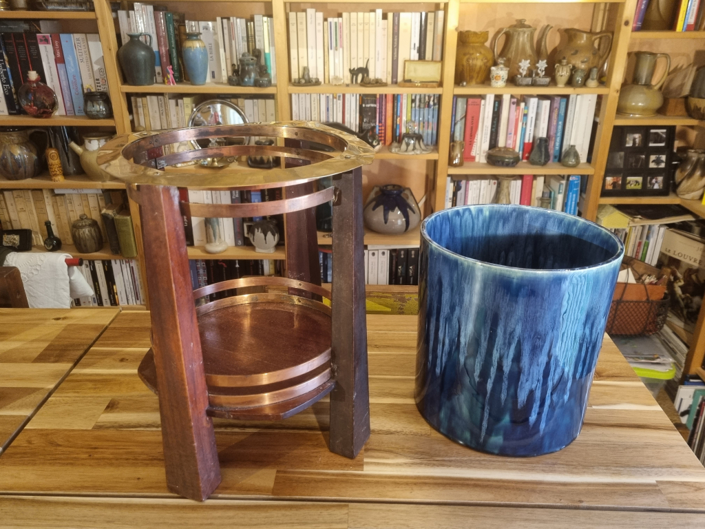 "Cache pot dans socle bois et cuivre. Dans la famille depuis 1930. Ressemble à un cache pot de Gustave Serrurier-Bovy. Hauteur totale 32 cms Diamètre 27.5 cms (cache pot = 20 cms) Parfait état."