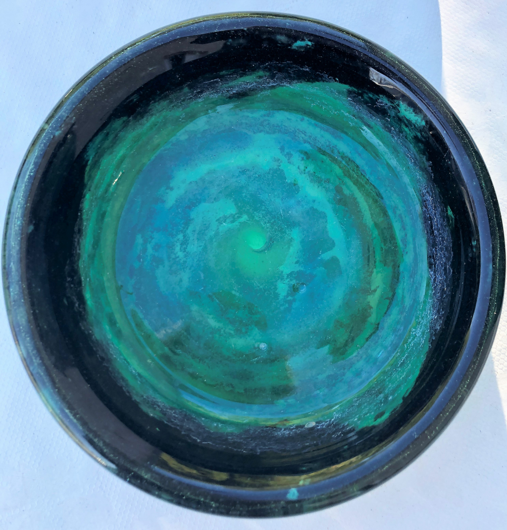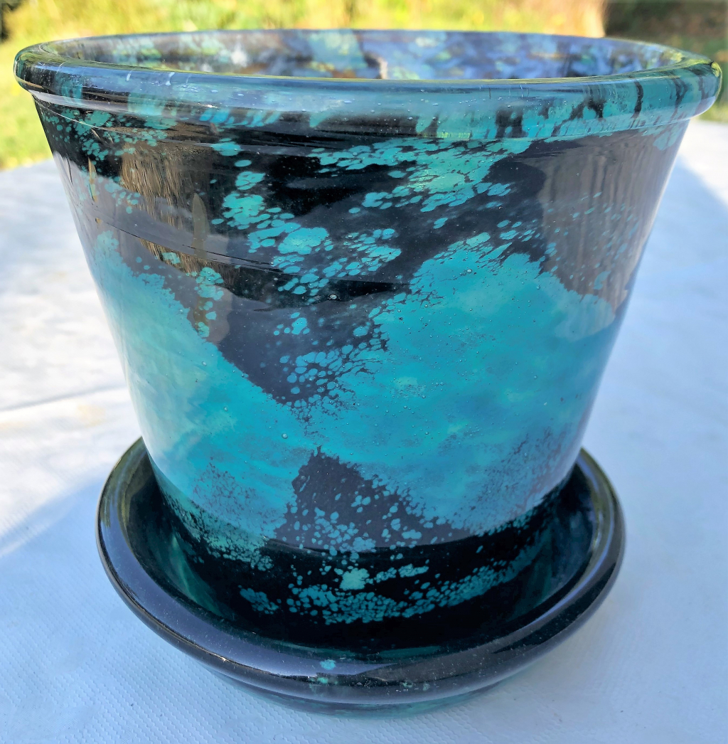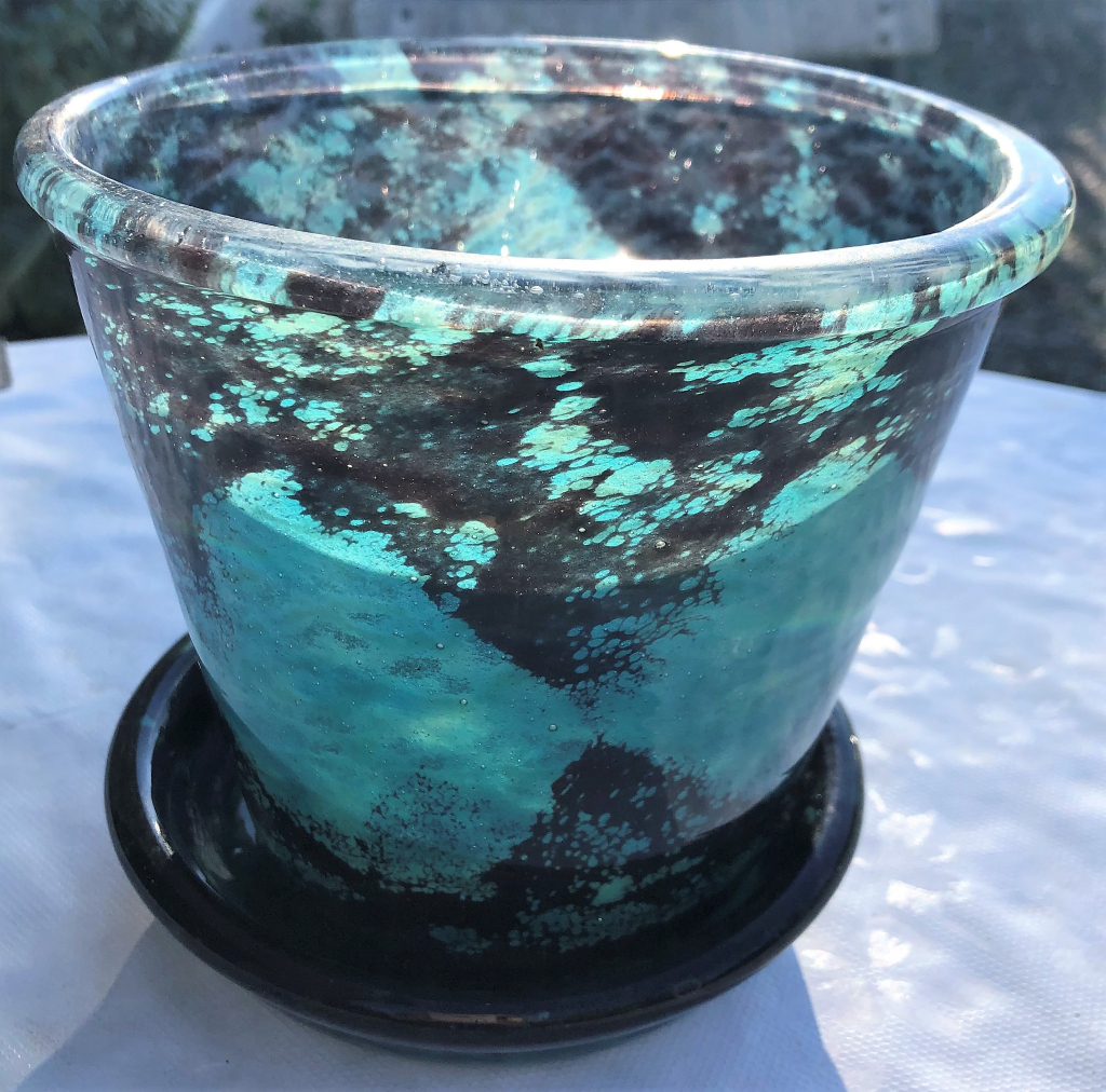 "Cache pot avec coupelle DAUM NANCY en excellent état général. Hauteur 20 cm environ et diamètre 14 cm. Couleurs dégradées du vert au noir. Pas de facture. Je le tiens de ma grand mère..."