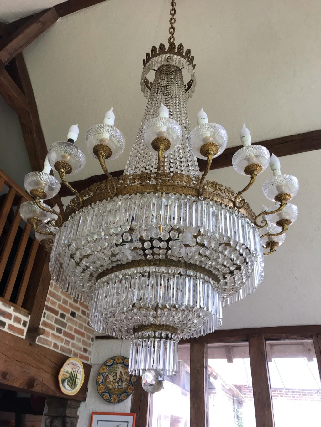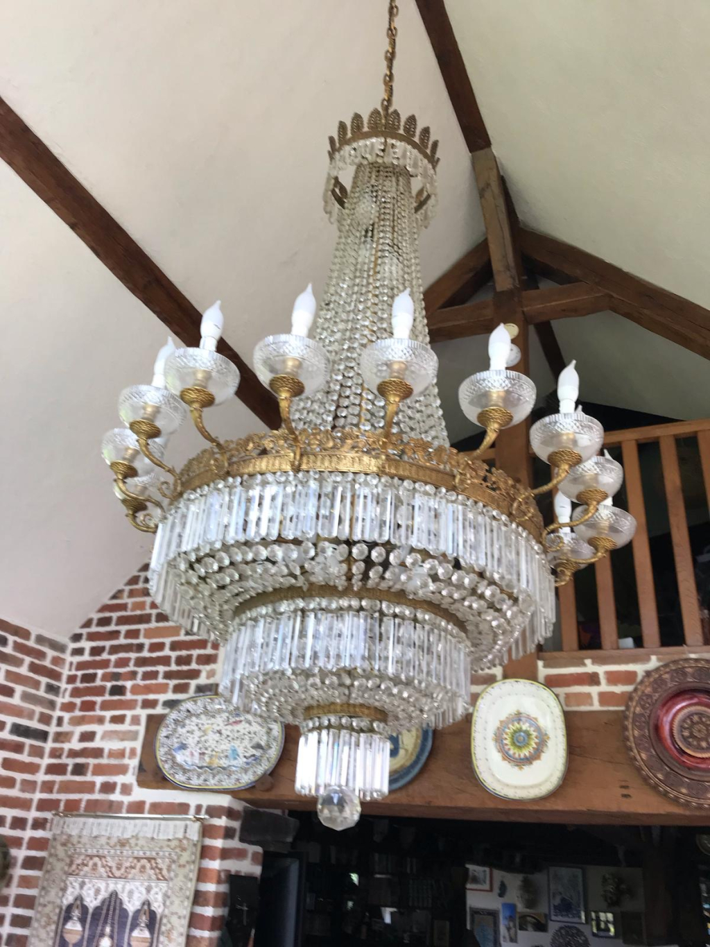 "Lustre en cristal de Murano de grande taille, mesurant 180 cm de hauteur et pesant environ 90 kg. Il présente une structure en métal doré ornementé avec de nombreuses pampilles et perles en cristal clair, typiques de la fabrication Murano. Le lustre possède plusieurs bras supportant des ampoules en forme de flamme, chacune entourée d'un cache-verre en cristal taillé. L'ensemble est en bon état apparent, avec un brillant notable sur le cristal et peu de signes d'usure visibles. Le design est élégant et classique, très représentatif de l'artisanat vénitien en verre soufflé et taillé. C'est un objet d'art et de décoration mural suspendu, destiné à un éclairage d'ambiance à l'effet luxueux."