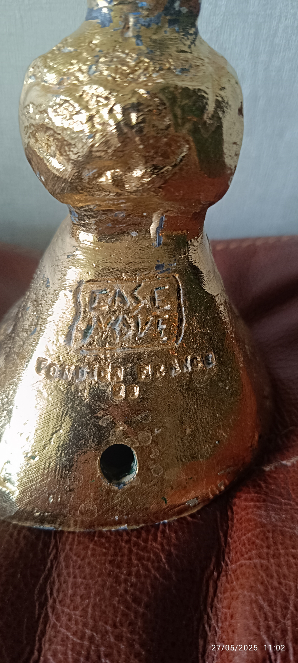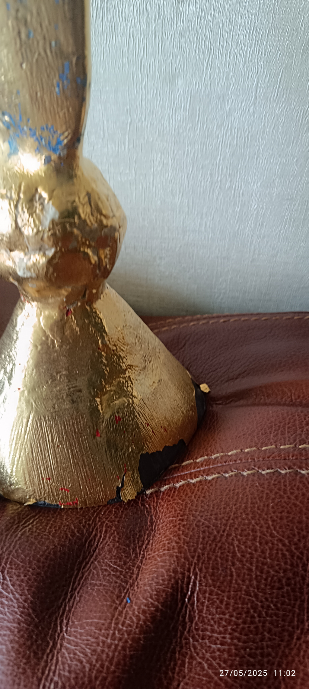 "Deux pieds de lampe probablement en métal doré à la feuille d'or, un des deux est signé Casenove Fondica. Hauteur 47 cm. L'état présente des éclats et des zones d'usure visibles dans le revêtement doré notamment à la base. Le métal semble texturé et travaillé artisanalement, avec des formes sculpturales représentant des motifs ornementaux : une figure féminine sur un pied et un oiseau sur l'autre. La signature est gravée dans le métal sous l'un des pieds, avec l'inscription Casenove Fondica 99. Ces objets sont décoratifs et pourraient appartenir à une collection Art Déco ou design vintage, soulignant une pièce d'art fonctionnelle."