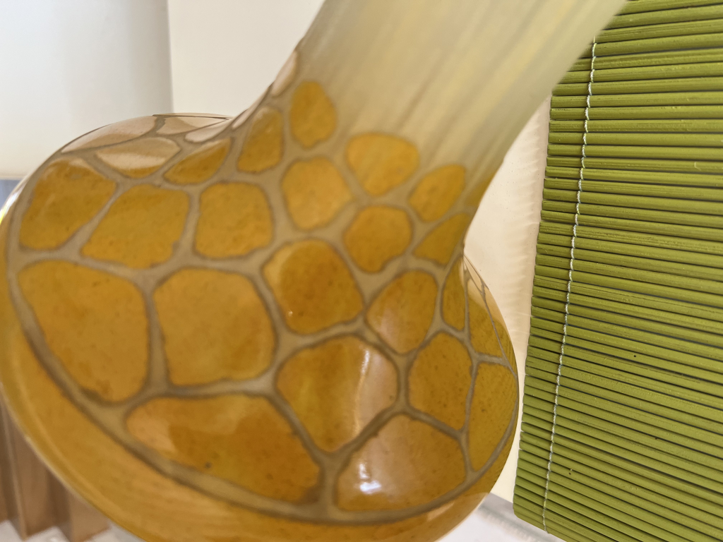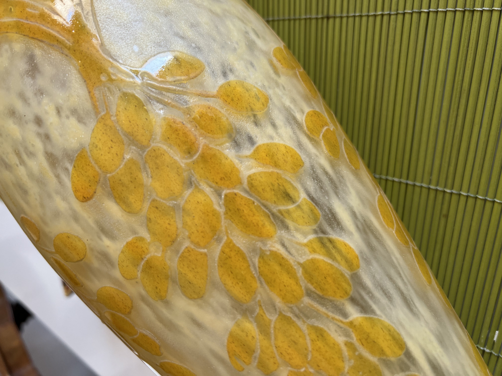 "deux Grand vase de forme balustre en verre gravé a l'acide à décor de dattiers stylisés sur fond jaune. Signé au berlingot. Hauteur 60 cm 17,5 cm à la base."