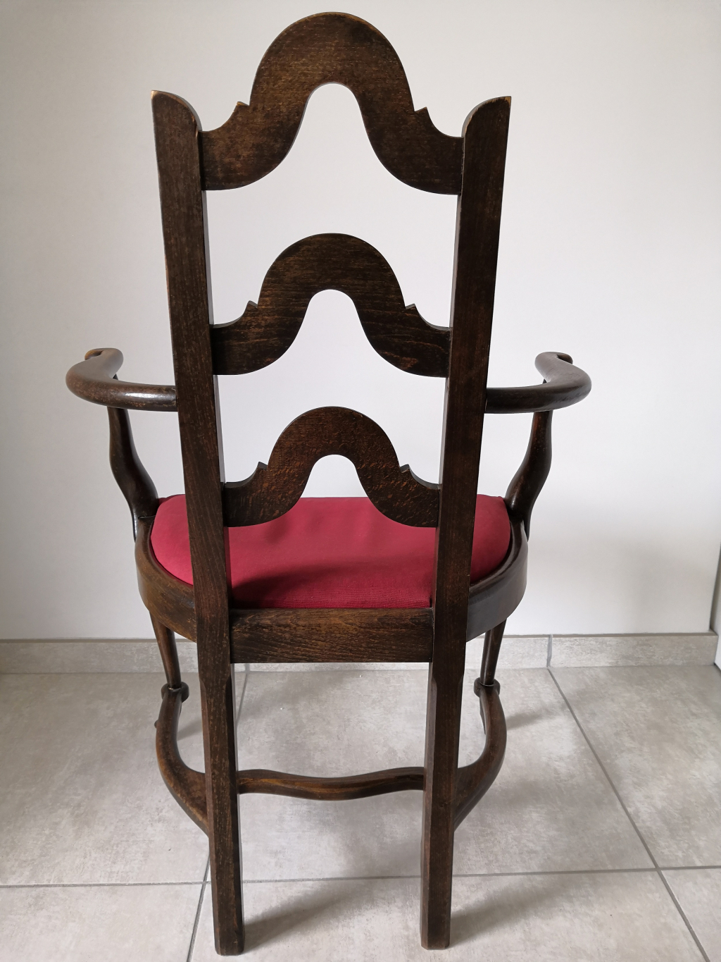 "5 fauteuils des années 50, assise en tissus rembourrée. Pas de marque visible."