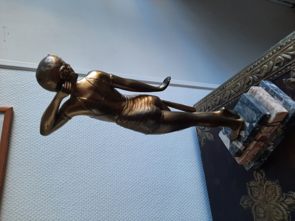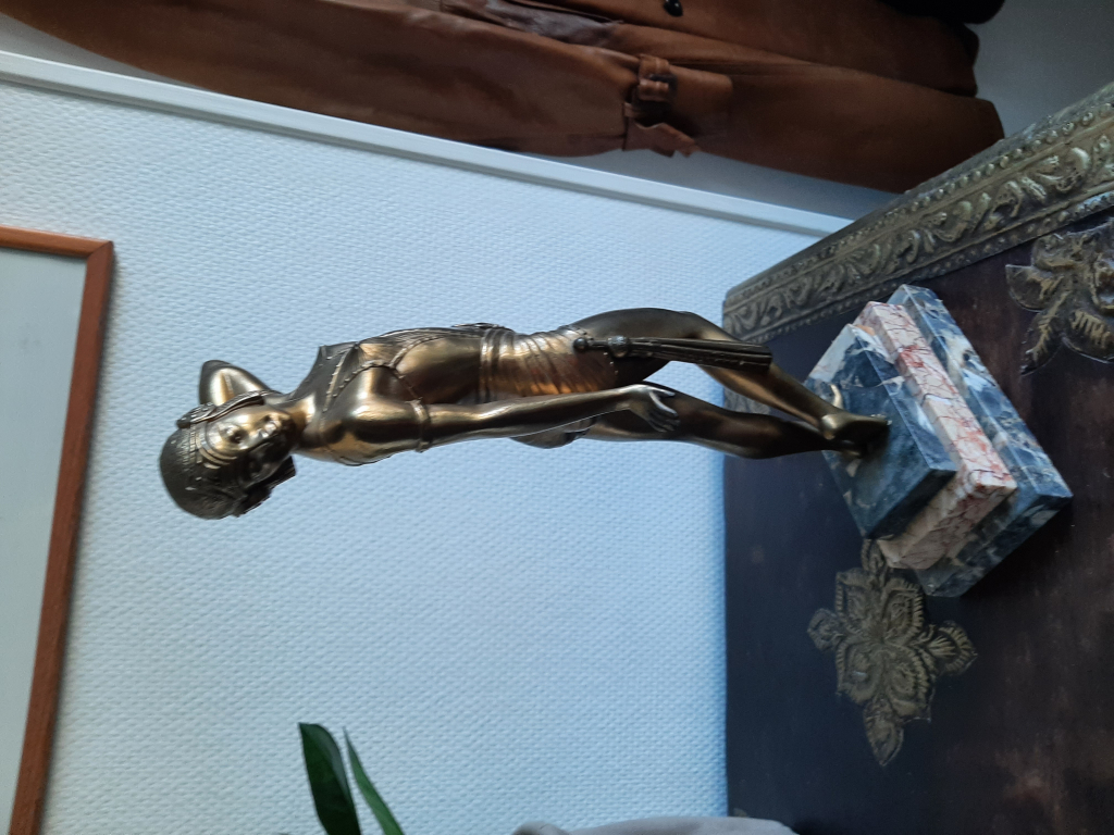 "Bonjour, Il s'agit d'une statuette 1925 sur un socle en marbre. Hauteur totale 37 cms. En régule poids 2 kg. Belle patine dorée. Il manque une aigrette ? Sur le sommet de la tête. Elle est en très bon état Merci. Cordialement. Ch. Espinasse"