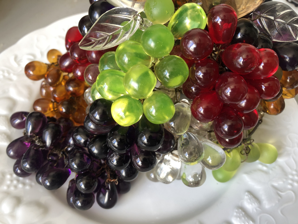 "Grappe de raisin faisant initialement partie d'une lampe ? éclairage ? Verres fixés au socle par fer. Poids de l'ensemble 1 kg 625 gr. La coupe n'est pas en vente avec la grappe de raisins"