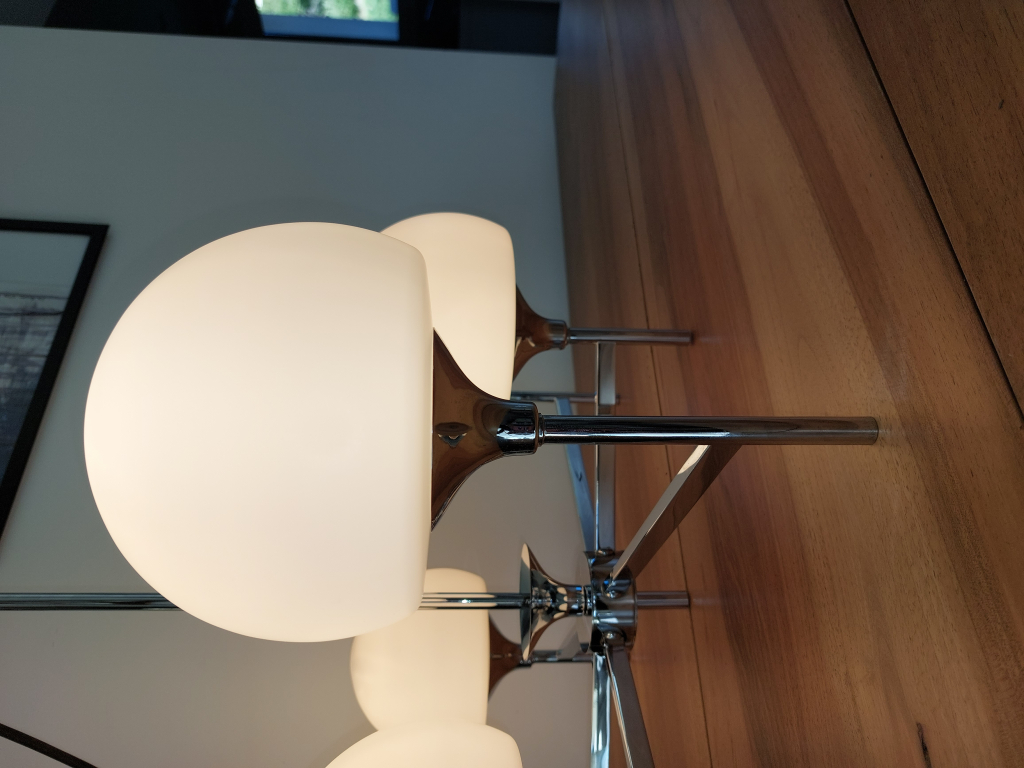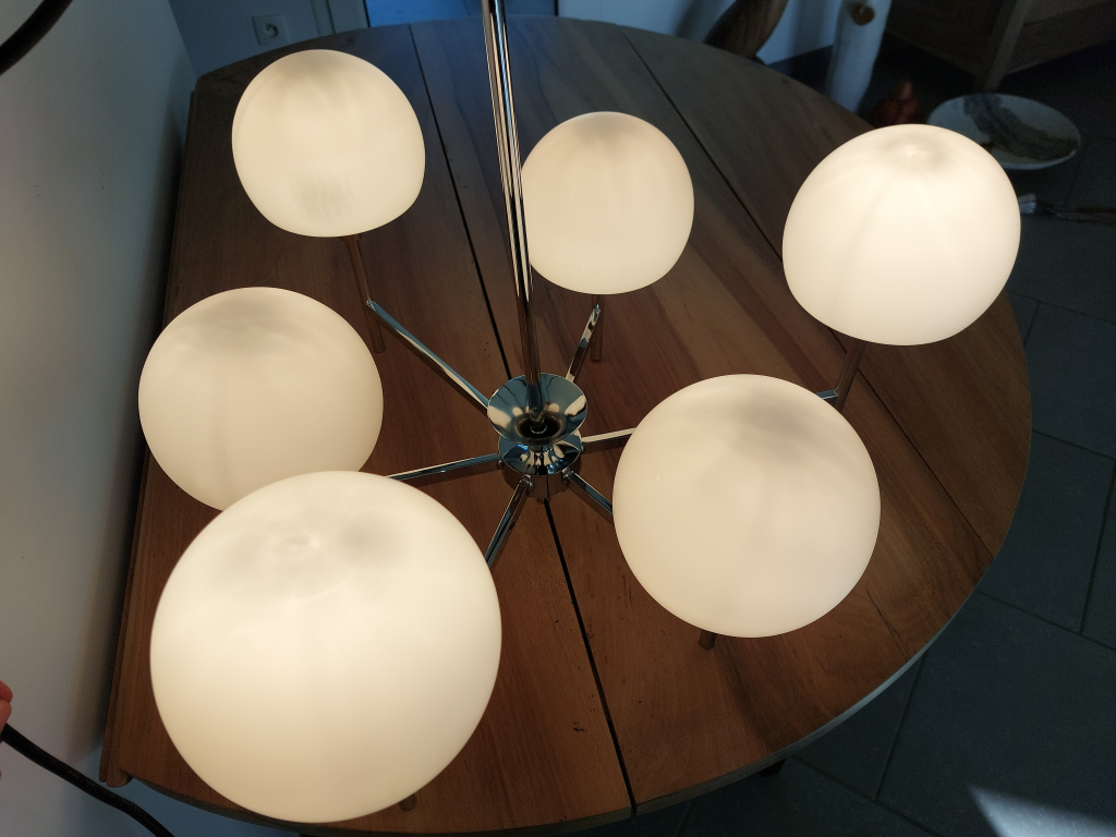 "Lustre ancien en parfait état (Sciolari?) Pas de trace de rouille et globes sans rayures ni impacts. Tout semble d'origine"