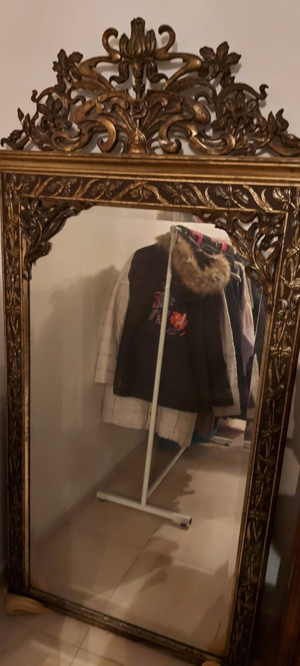 "Miroir biseaute doré en bois et stuc. Taille 98x180. Plutôt en très bon état."