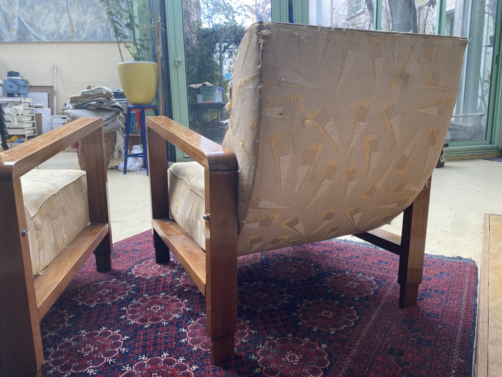 La première approche d’un professionnel du marché de l’art est visuelle. Nos équipes étudient dans un premier temps les différentes photographies de vues d’ensemble et de détails envoyées par le déposant avec sa demande : Paire de fauteuils art déco non rénové.