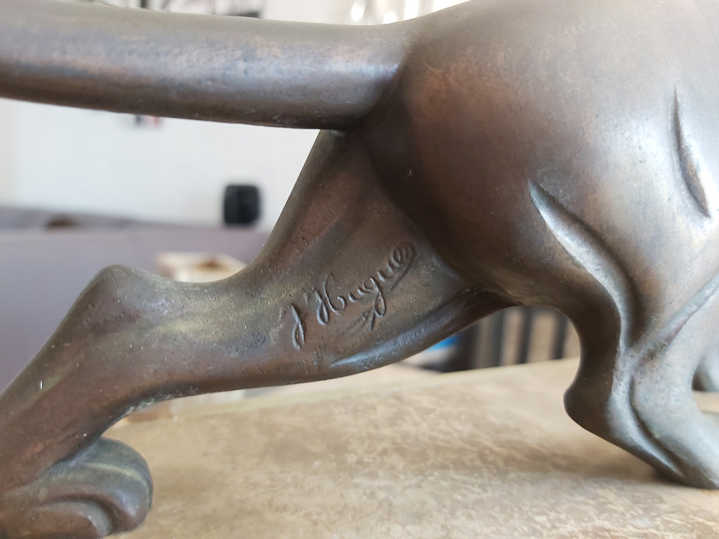 "Panthère en bronze signé j hugues sur patte arrière gauche sur pendule marbre art déco Dim de la Panthère 38 cm de longueur 10 cm de hauteur 4 cm de largeur"