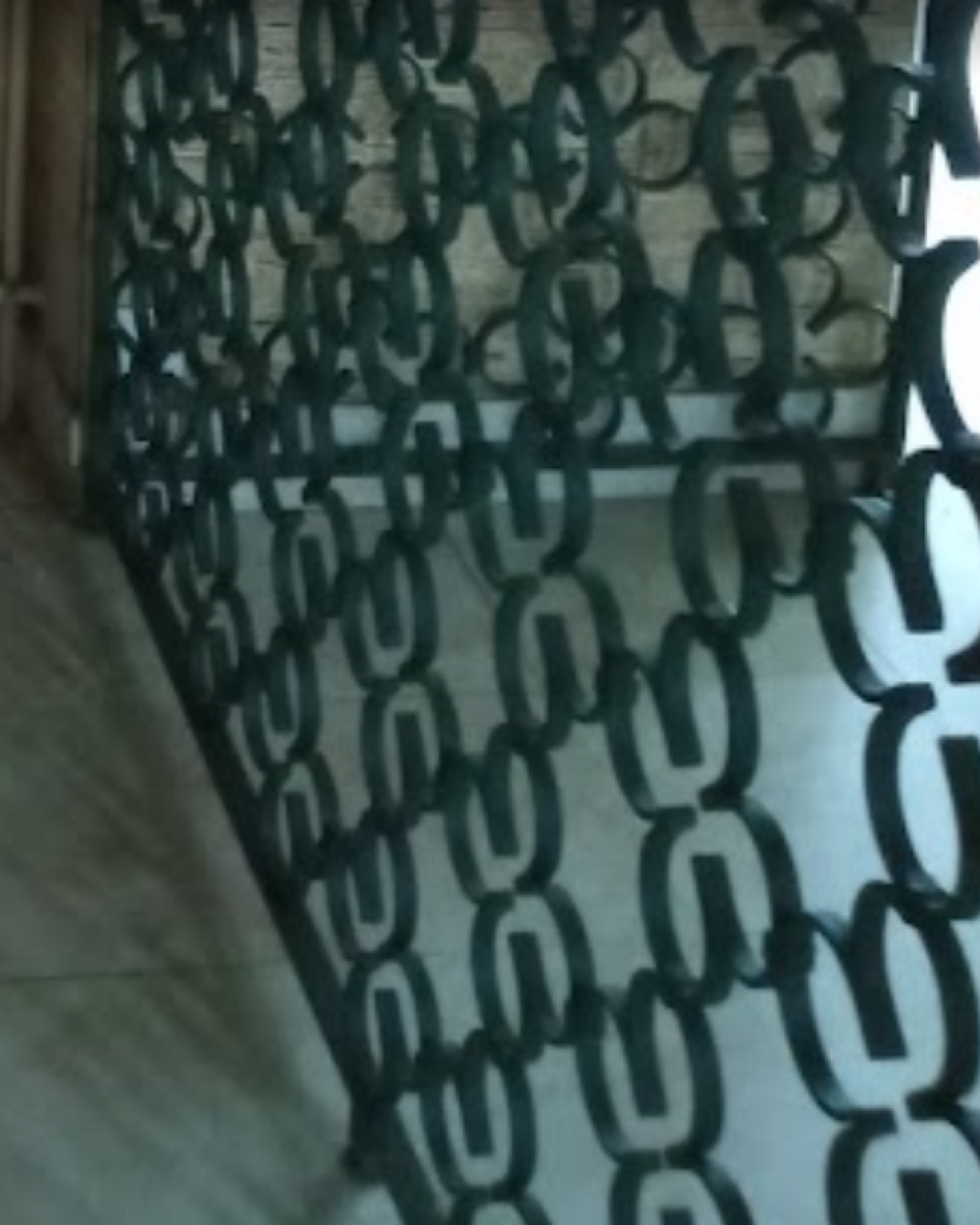 "C'est un paravent en fer forgé, à priori de style marocain, année 70. Il est en L : la plus petite partie mesure 0,76cm et la plus grande mesure 1m50 de large. Le tout sur 2m10 de hauteur et environ 4cm d'épaisseur. Il possède plusieurs accroches porte-manteaux. Pas de nom ou de détail particulier. Plutôt massif."