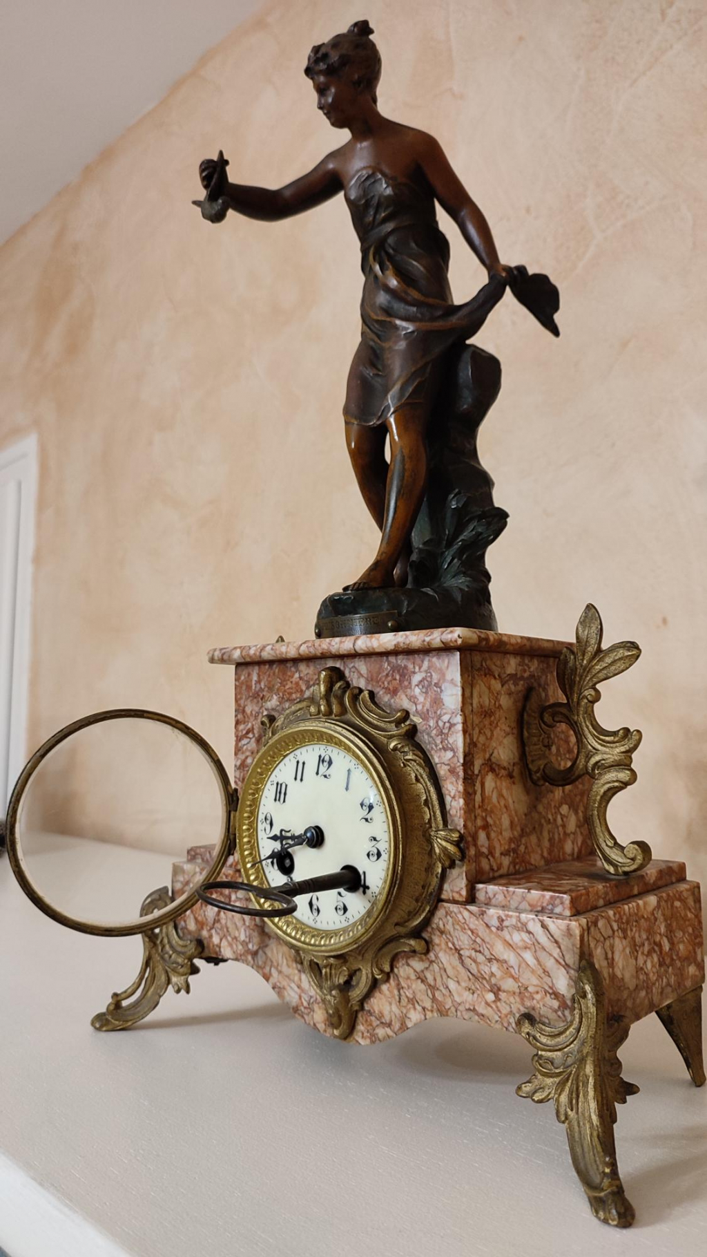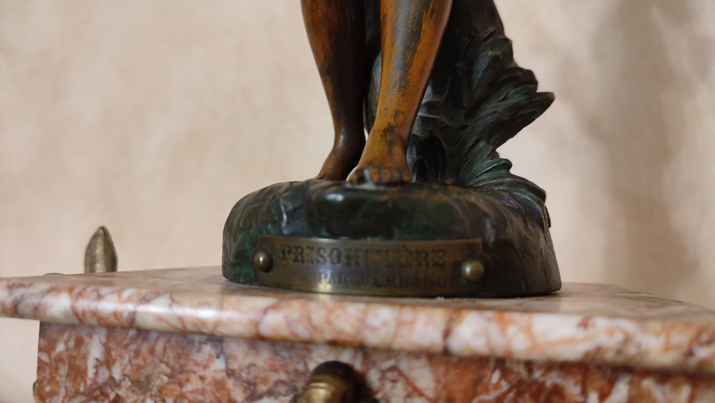 "Pendule signée Ferrand, surmontée d'une statuette (métal non identifié) Socle en marbre Estimation années 1930-1940 Pas de certificat ou facture"