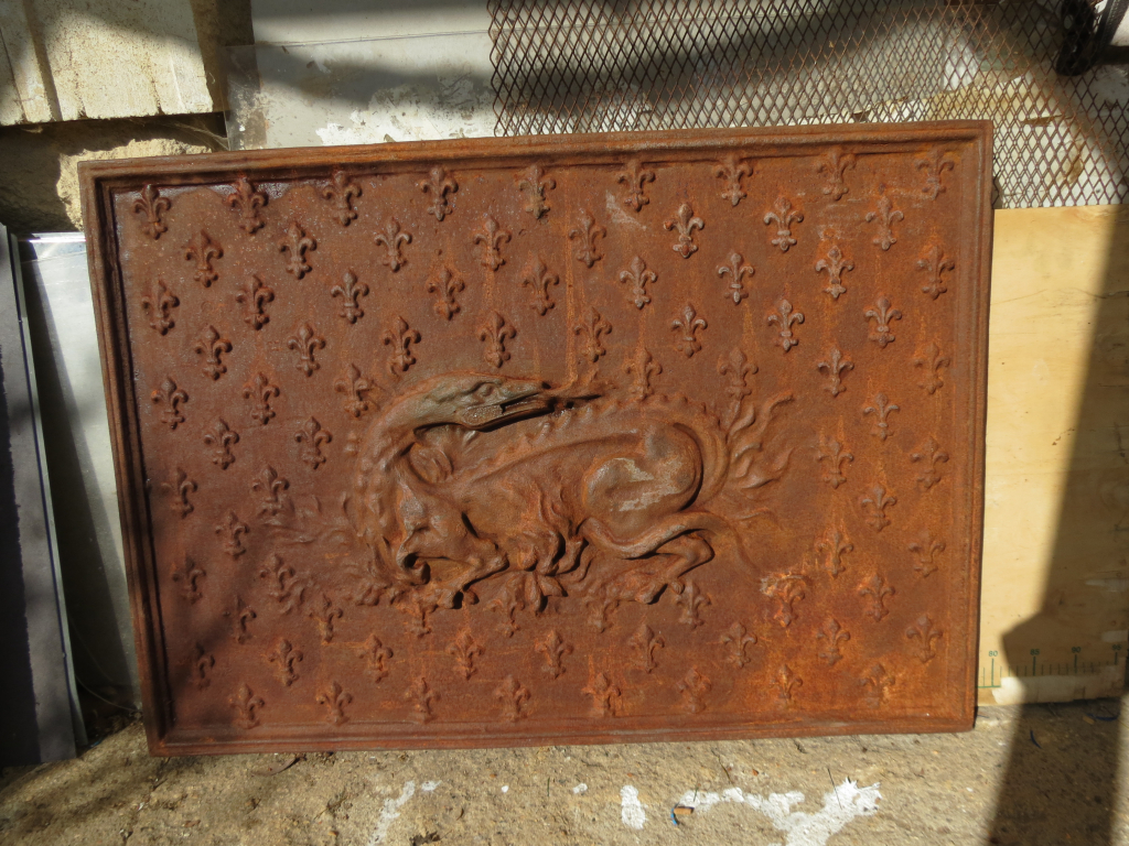 "je possède une plaque de cheminée elle fait 146kg avec dragon et fleur de lys en très bonne état désole je n'ai pas trouvé dans les catégorie pas de signature. cdl"