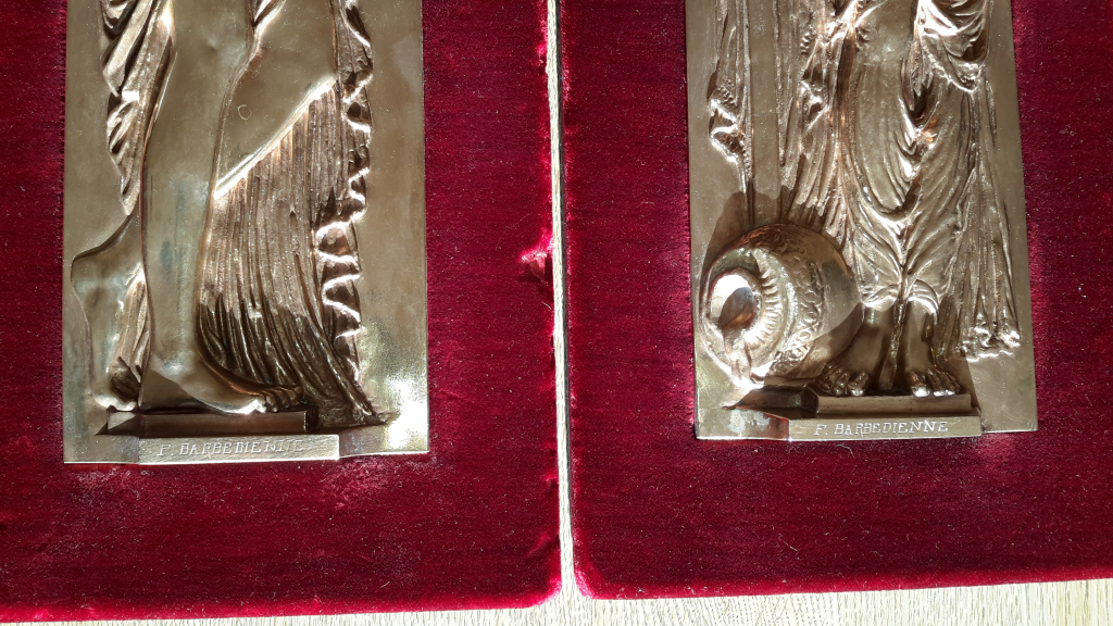 "Paire de Plaques haut relief mural en bronze doré, de 45 centimetres de haut sur 11,5 centimètres de large. Plaques Aux Naîades époque Napoléon III signées F Barbedienne période XIX eme"