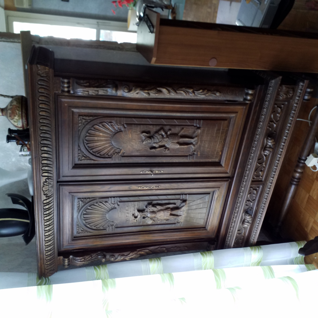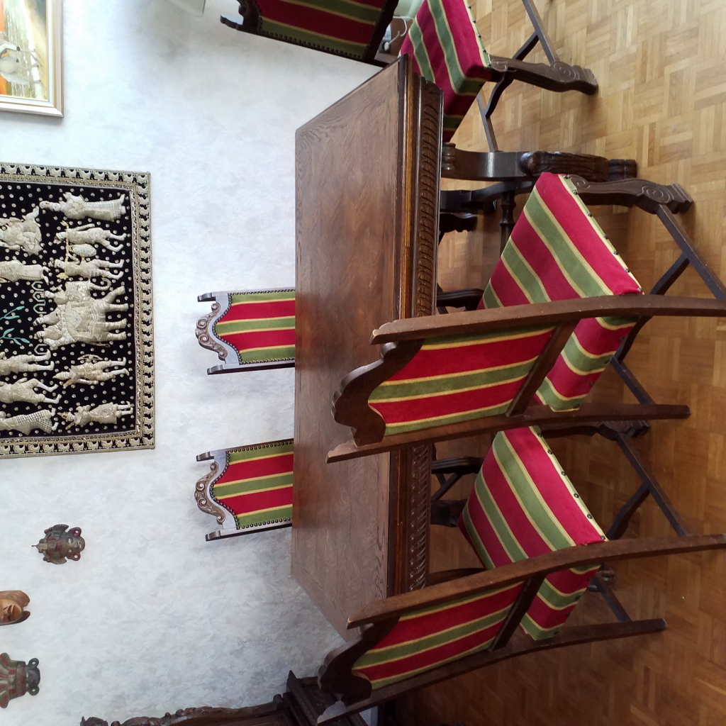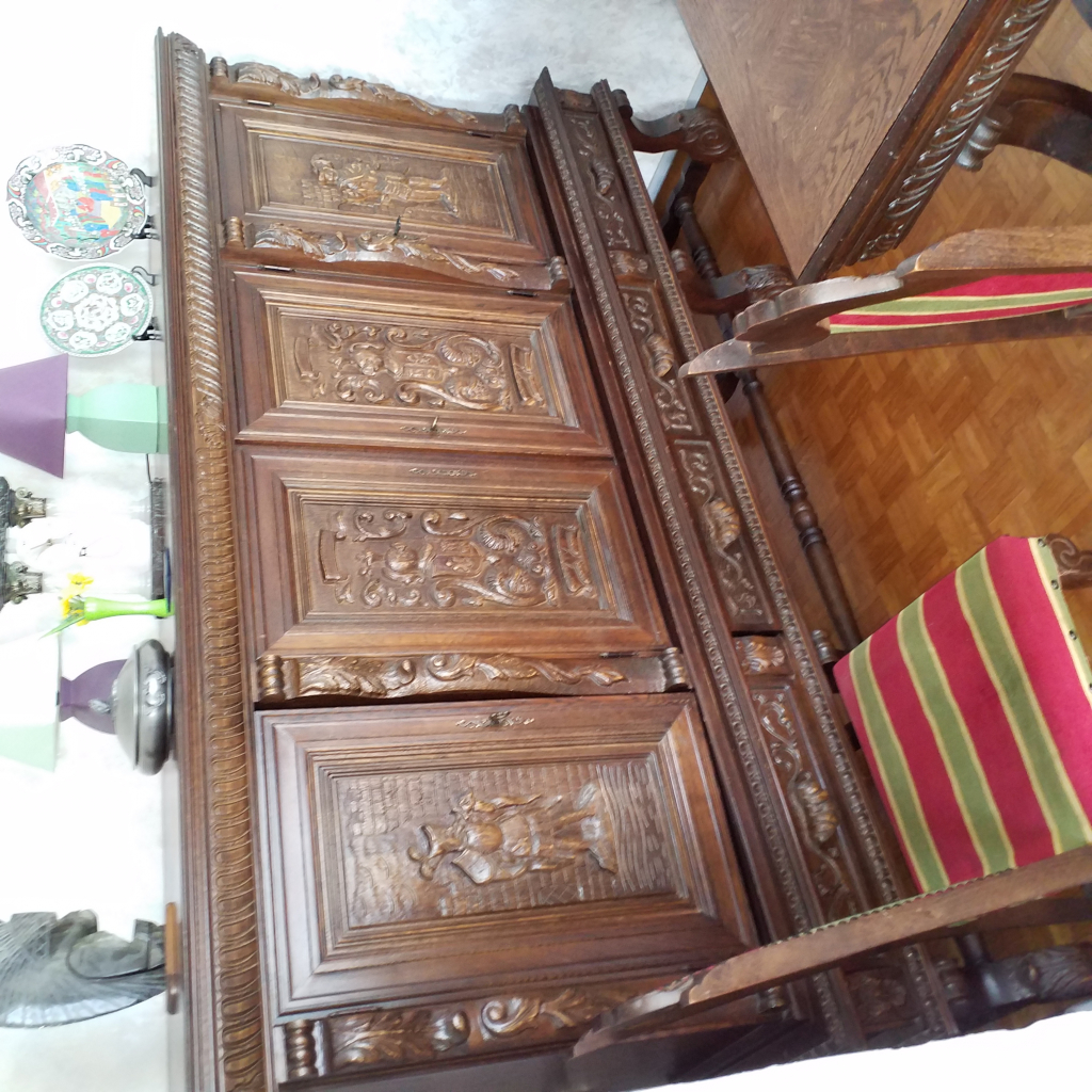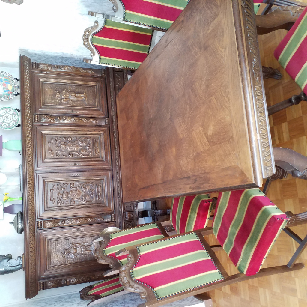"salle à manger style renaissance espagnole une table 166 x95 6 chaises tissus un buffet2 corps l 245x h 153 p 60 et un argentier l 130 h 175 p 50"