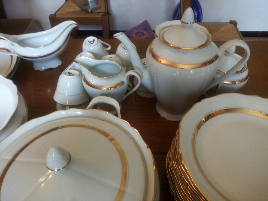 "service vaisselle excellent état blanc à liseré doré 24 assiettes plates, 12 assiettes creuses, 12 tasses, 12 sous-tasses, 1 cafetière, 1 pot à sucre, 1 pot à lait, 1 saucière, 2 petits plats ovales, 1 saladier, 1 soupière, 1 plat ovale, 2 plats ronds dont un creux."