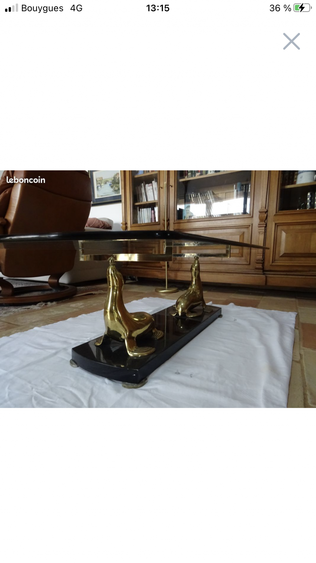 "Table basse avec socle bois laqué, deux otaries (bronze? Laiton?) soutenant un plateau en verre épais 4 pieds d angle sous le bois"