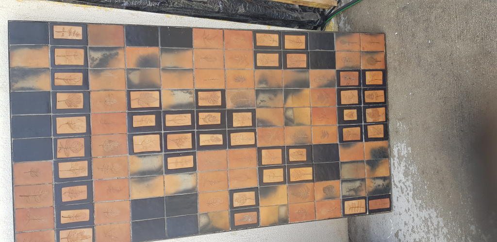 "Table basse carrelé signé Roger Capron Vallauris en céramique et acier"