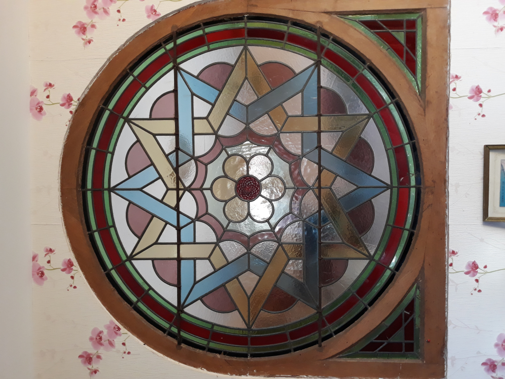 "Vitrail de 120 cm de diamètre, quelques verres fêlés. Ayant appartenu au Grand Hôtel de Vichy."