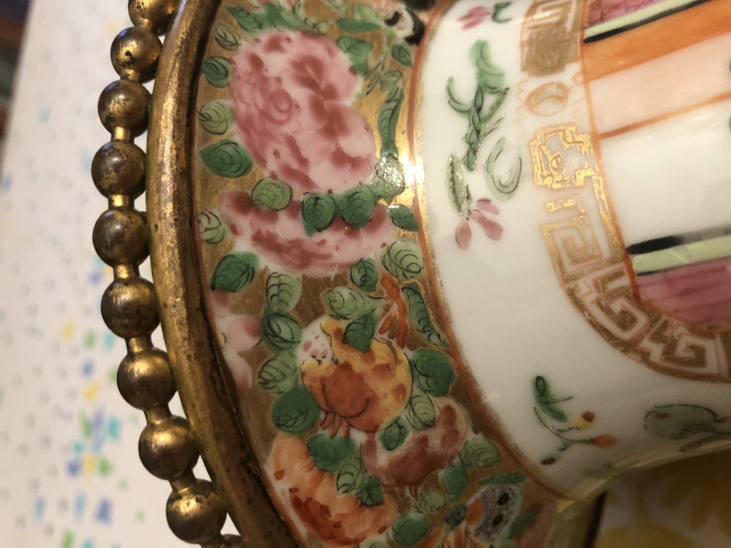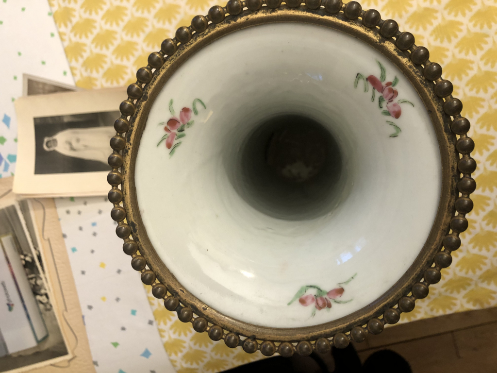 "Une paire de vases rouleaux décor chinois de 35 cm de haut, bronze et porcelaine. Aucune Facture ni signature."