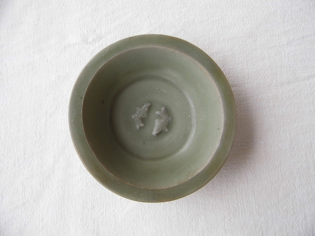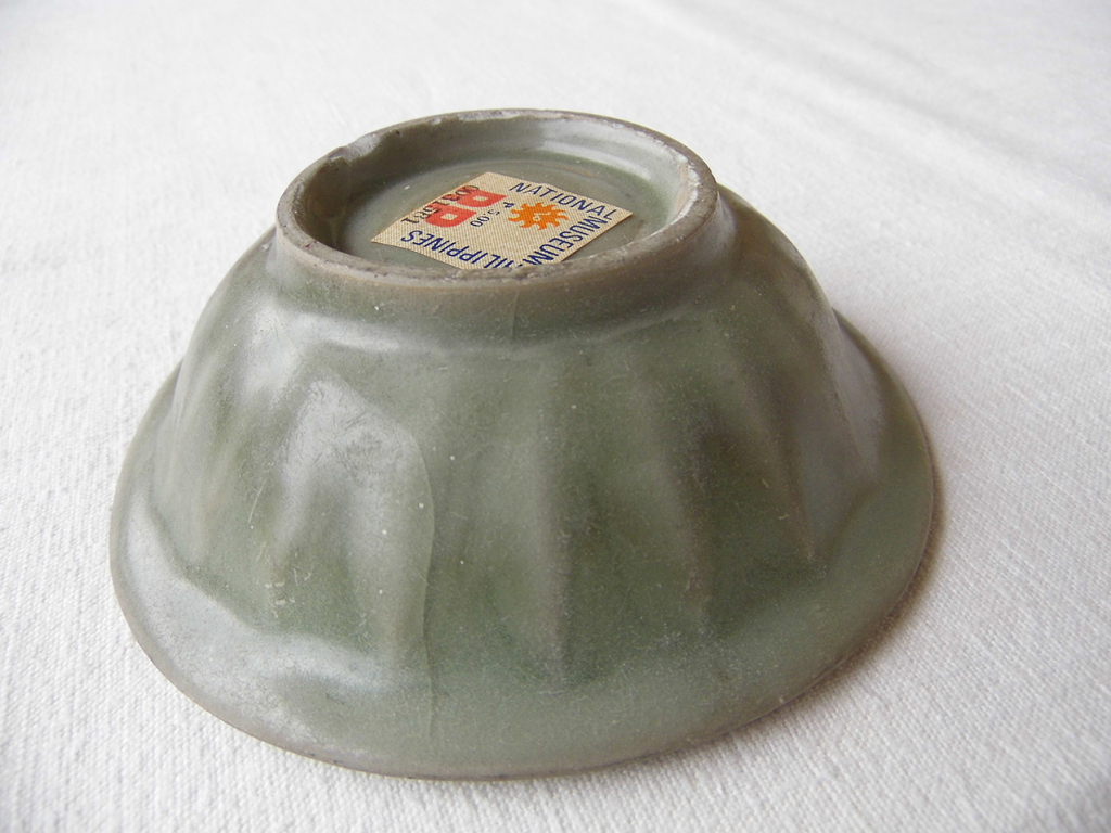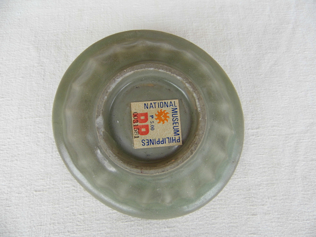 "Bol céladon chinois (période Song ?), avec deux poissons tête bêche en relief dans le fond. Extérieur du bol avec relief végétal. Coupon numéroté 0031581 du Museum National des Philippines. Petit manque au pied du bol. Diamètre : 13 cm environs"