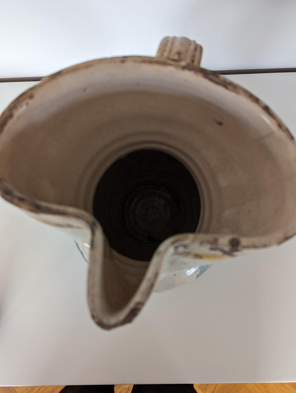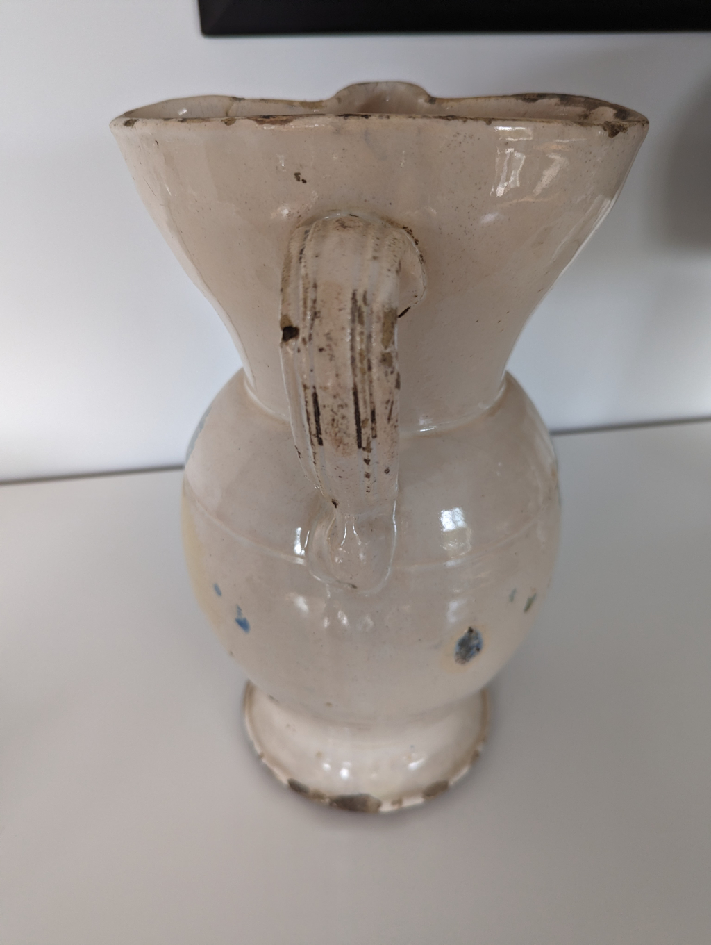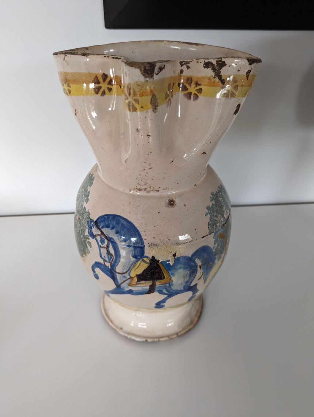 "Bonjour C'est un broc italien en majolique (?) peint avec cheval et environnement végétal. Il a des signes d'usure"