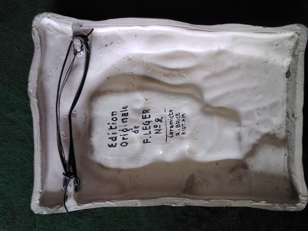 "Il s'agit d'une céramique réalisée par Fernand Léger en 1952,en parfait état, d'environ 30 cm de large sur 50 cm de hauteur, accrochée au mur, représentant 2 mains devant un visage féminin. 3 couleurs utilisées: blanc, noir et rouge."