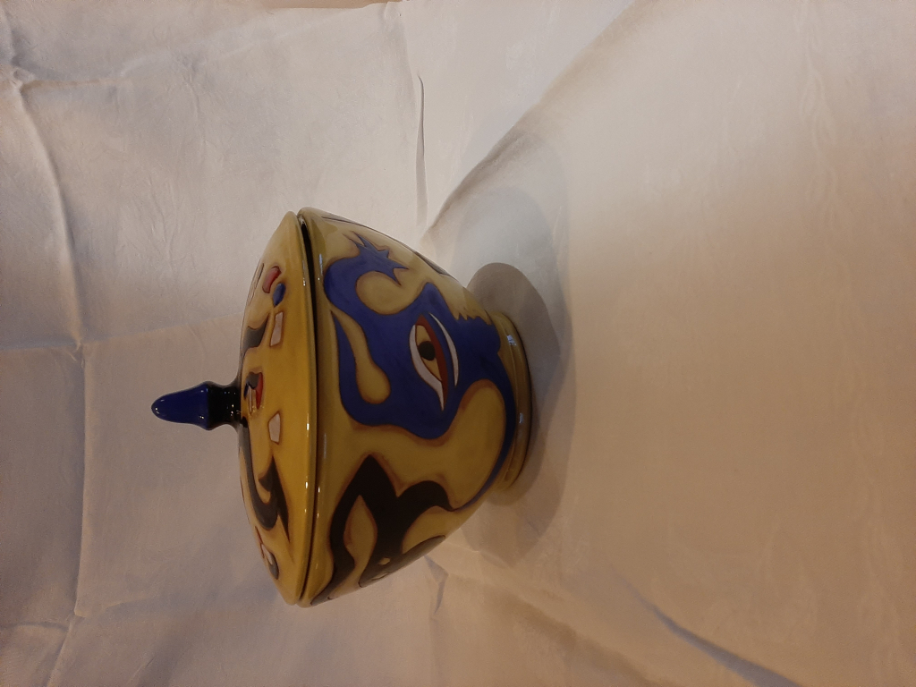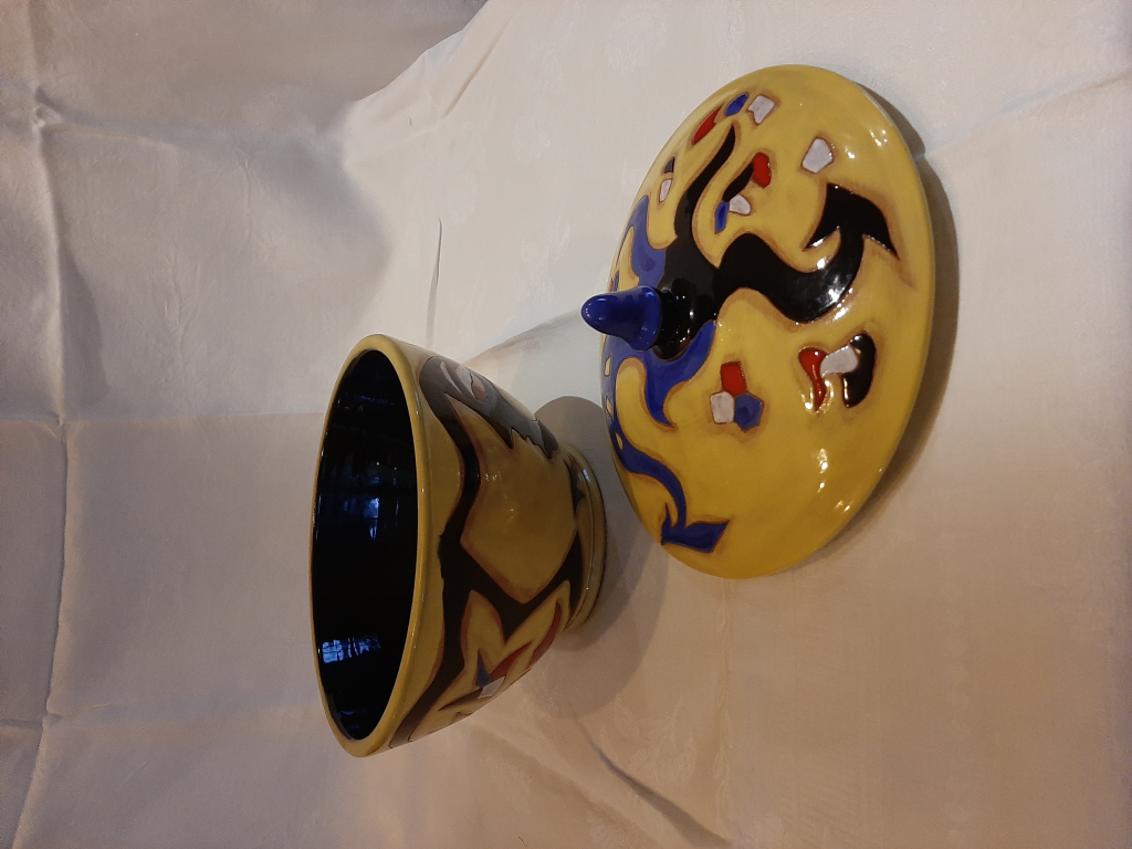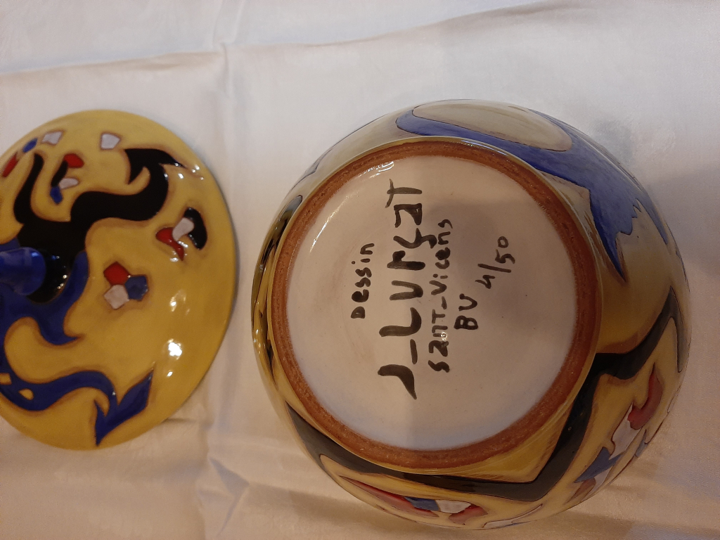 "Soupière en céramique en excellent état (aucun éclat , aucune tâche) Hauteur avec couvercle: 23 cm Hauteur sans couvercle: 13 cm Diamètre: 23 cm Signée: Dessin Jean Lurçat Sant-Vicens BV 4/50"