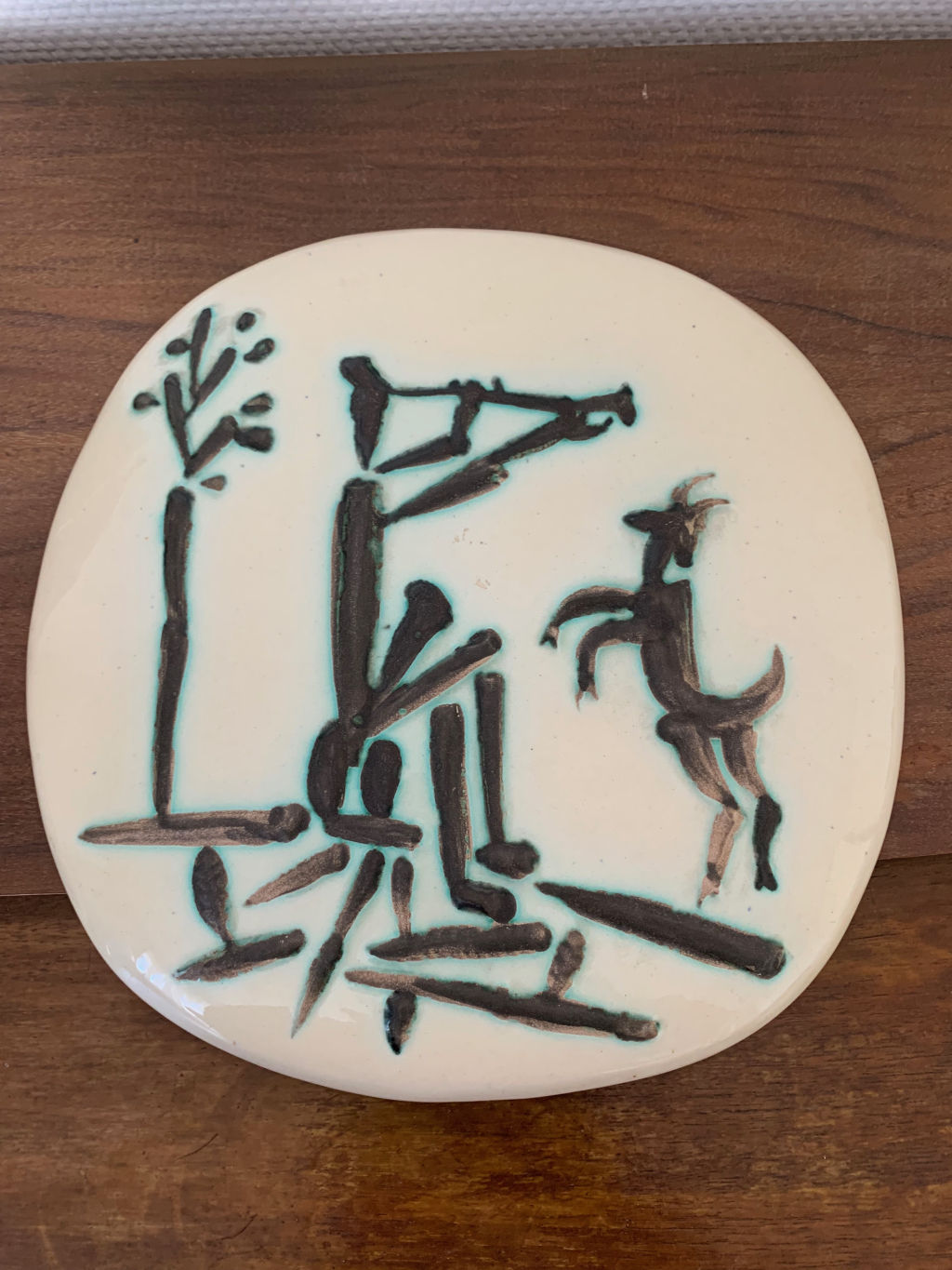 "Assiette céramique PICASSO "Joueur de flûte et chêvre" estampillé au dos : EMPREINTE ORIGINALE DE PICASSO / MAROUDA PLEIN FEU Plaque en céramique en faïence blanche à oxyde noir et glaçure blanche. Diamètre : 25cm Année : 1956 450 exemplaires"