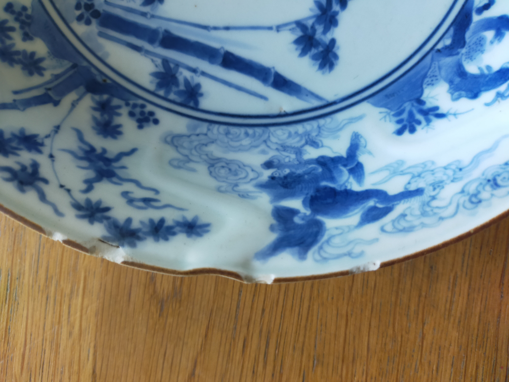 "assiette en porcelaine de Kakemion de la periode Edo. Nous avons deux assiettes de ce style. celle là est ébréchée sur le bord à deux endroits"