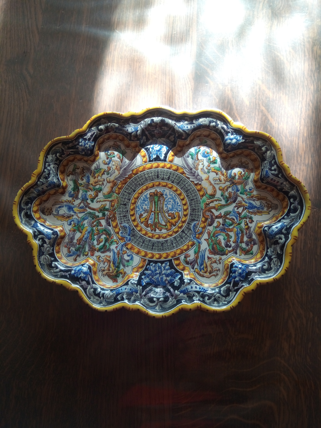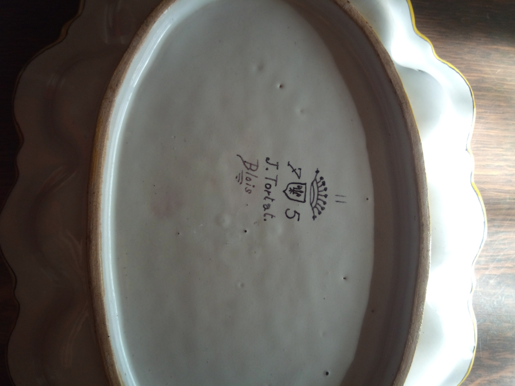 "Artiste Josepha Tortat de 1875 excellent état. Plat de long.30cms large.22cms.au centre des initiales ,décor chimères,dragons"
