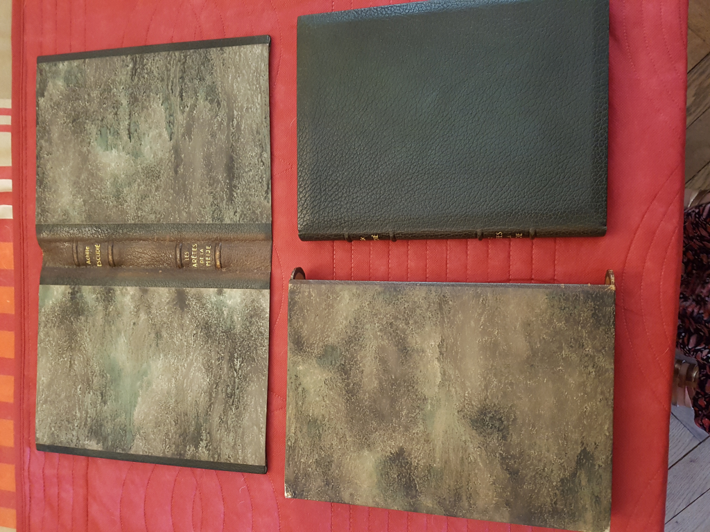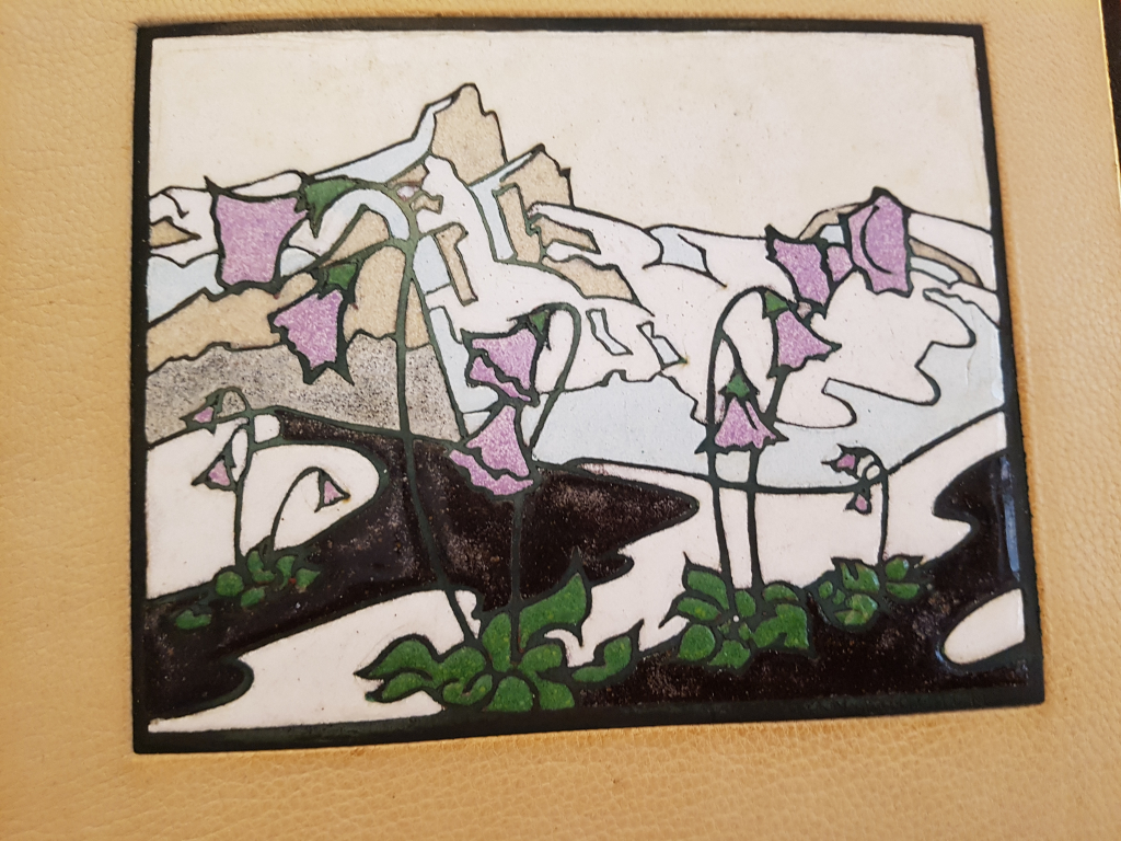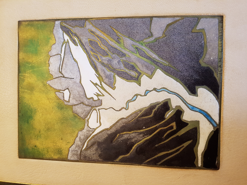 "Deux émaux colorés de Jean Goulden insérés sur les plats intérieurs d'une reliure de Crettet (successeur de Marius Michel). Dimensions : 19 X 13.5 cm et 11X 14 cm. Titre du livre : Les arêtes de la Mèje, Achille Escudié, exemplaire de l'auteur (ex-libris)."