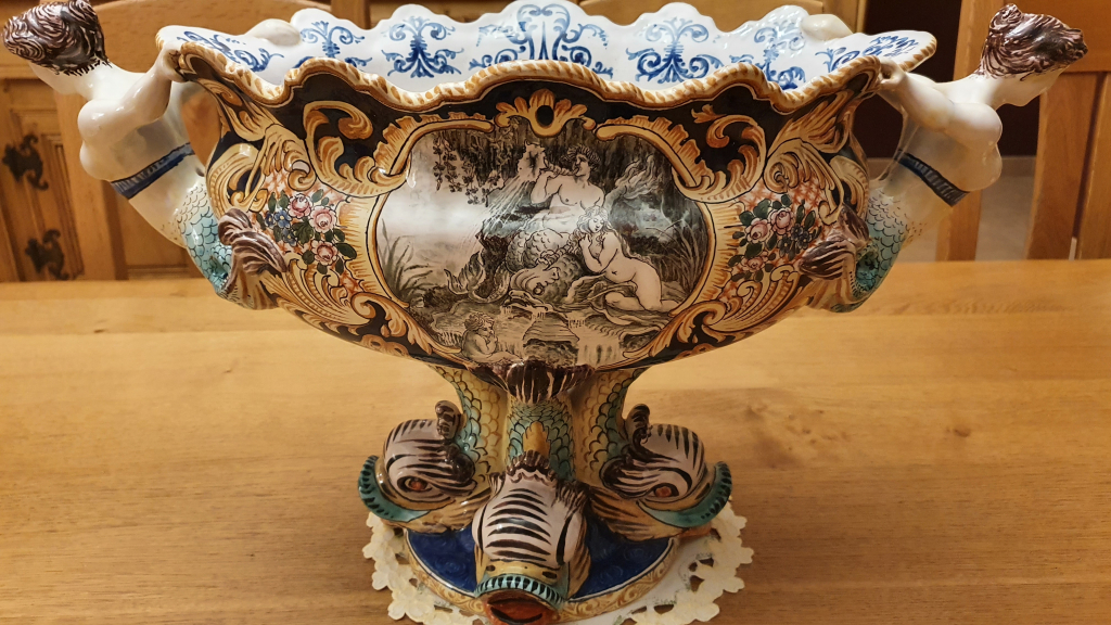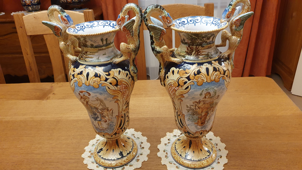 "Deux petites restaurations sur la plus grosse pièce : une de remplissage sur les cheveux d'une des 2 sirènes et une sur le bec d'un des poissons sur le pied. Pas de restauration sur les 2 autres vases.. Les 3 céramiques sont un ensemble et comporte la même signature. Pas de certificat ni de facture. Achat sur site de vente occasion dans les années 2010. Les dimensions notées sont ceux de la plus grosse pièce. Dimension des 2 vases :Hauteur 42 cm largeur 23 cm"
