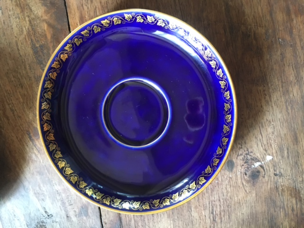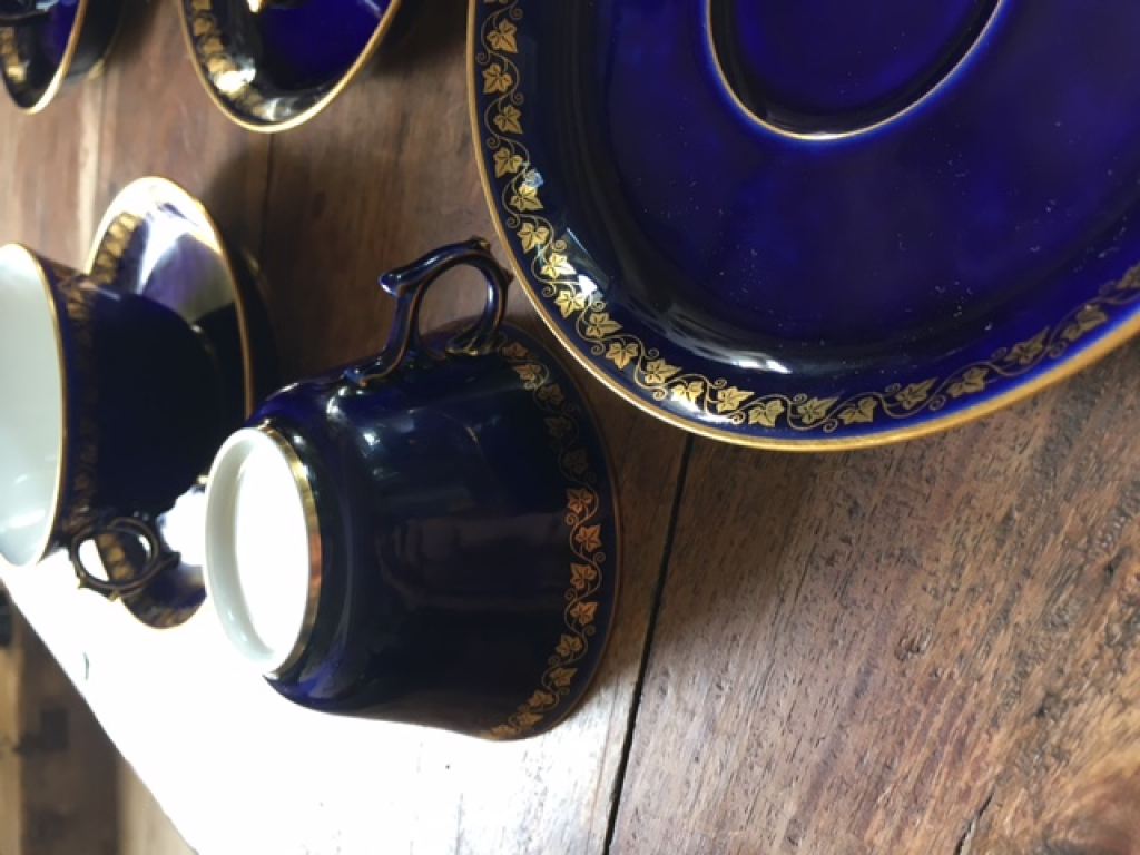 "Bonjour, Huit tasses et sous tasses en porcelaine bleu de Four et décor or de feuilles de lierre. Diamètre sous tasse 13,5 cm Diamètre tasse 8.5 cm Le tout en parfait état."