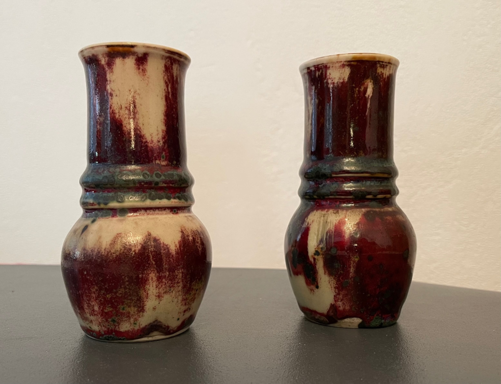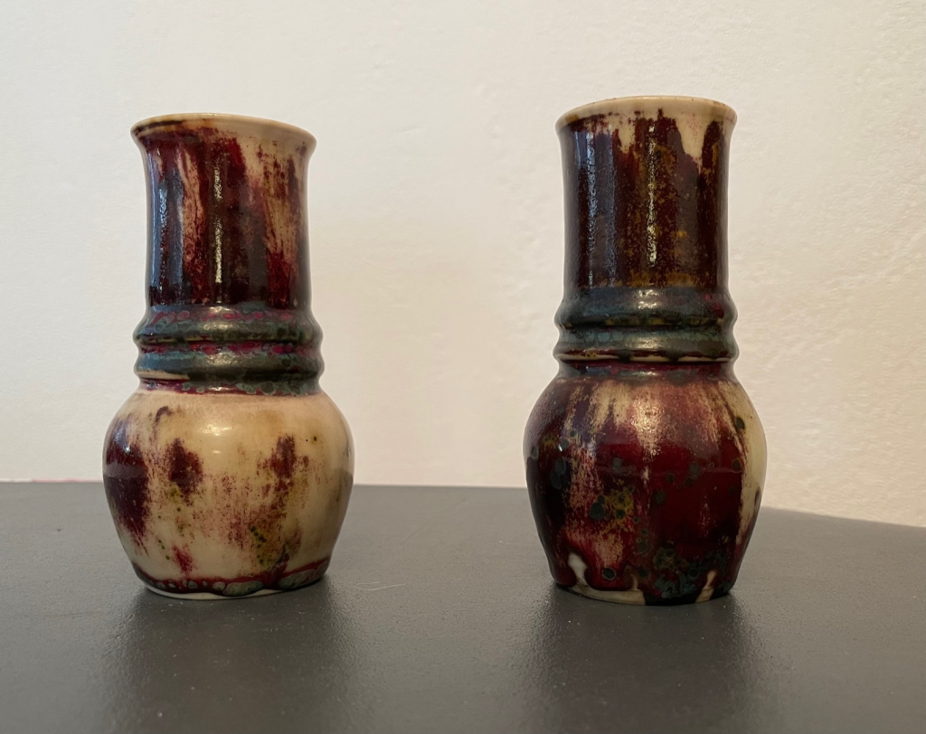"Paire de vases Dalpayrat en très bon état, sans choc, ni défaut, de tailles et formes identiques, avec émaux de mêmes couleurs mais répartis différemment. Signature, cachet et numéro gravés sous chacun d'eux. Hérités de la famille de ma grand-mère"
