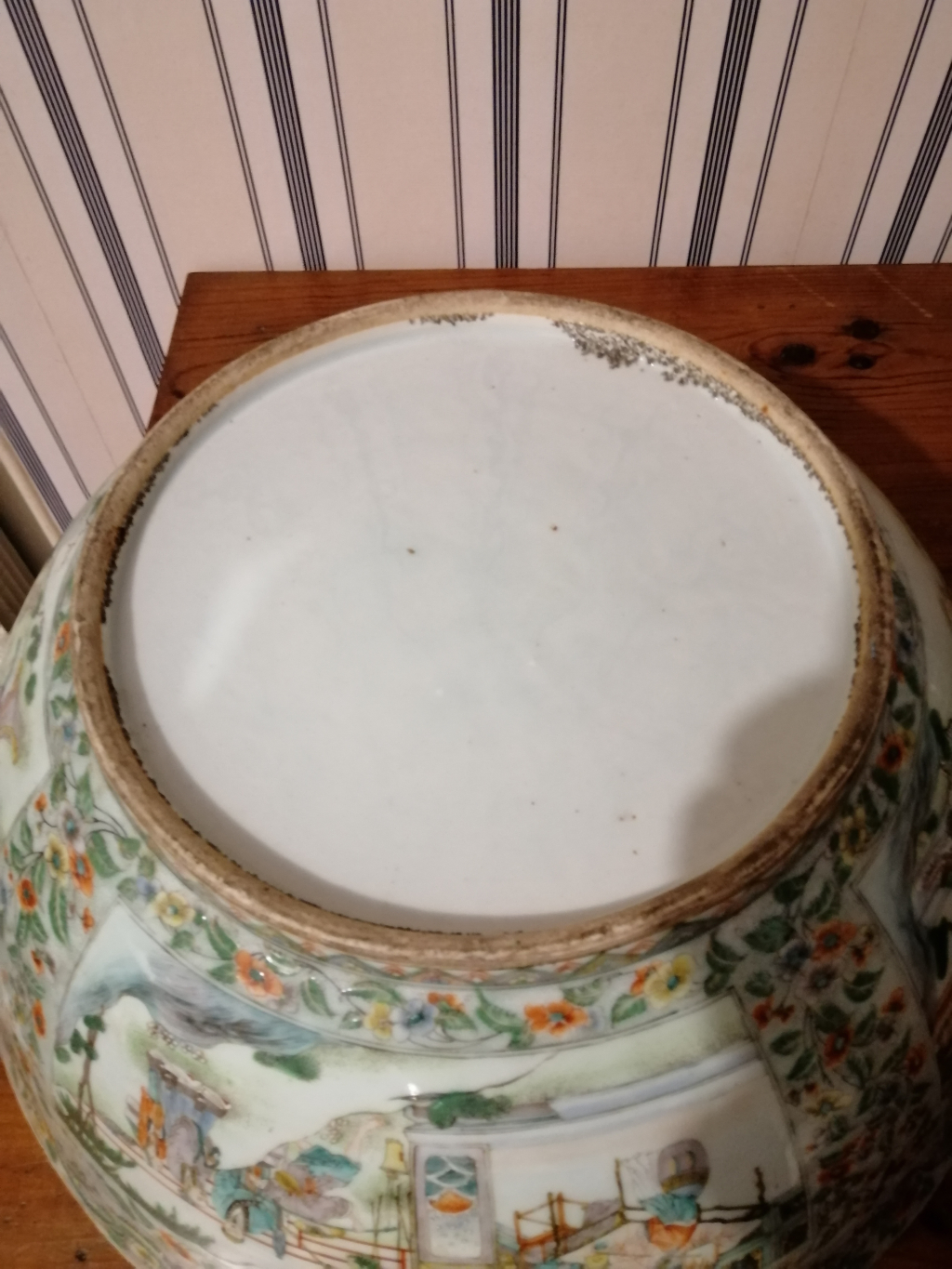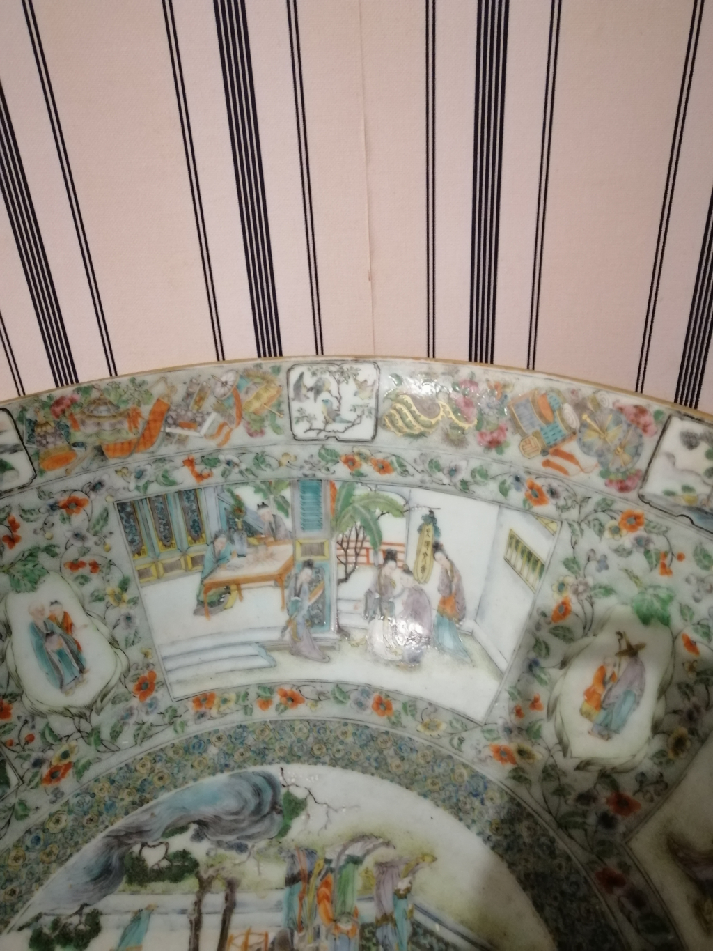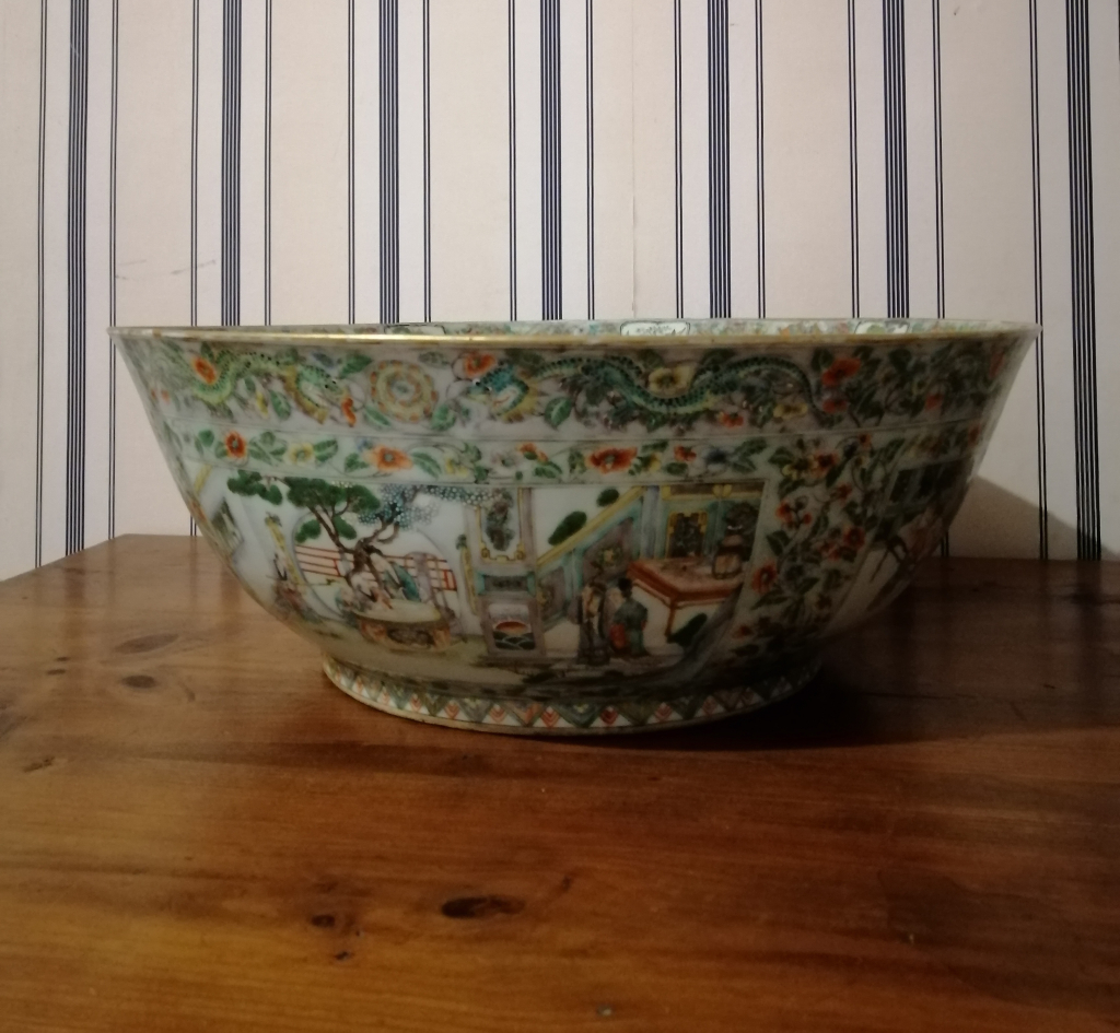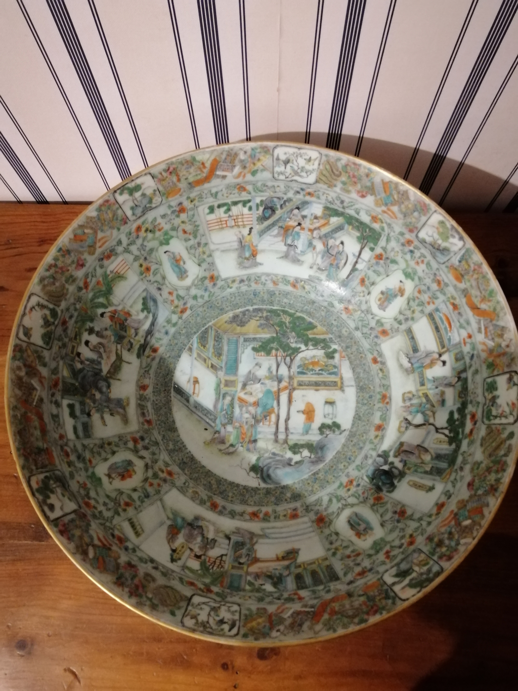 "Grande céramique en forme de bol évasé, très richement décorée de scènes de vie chinoise. Famille verte ? 1 éclat ancien à l'arrière de la ceramique. Heritage suite au décès de notre maman. Pièce ramenée par le grand père de notre maman qui était capitaine de marine marchande."