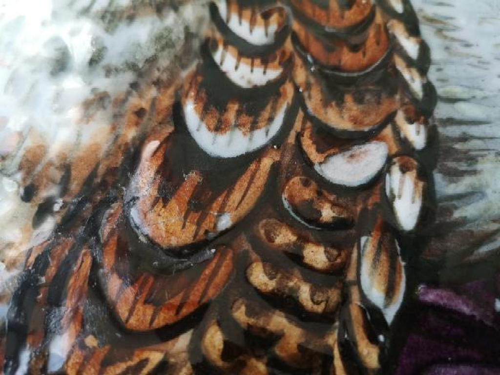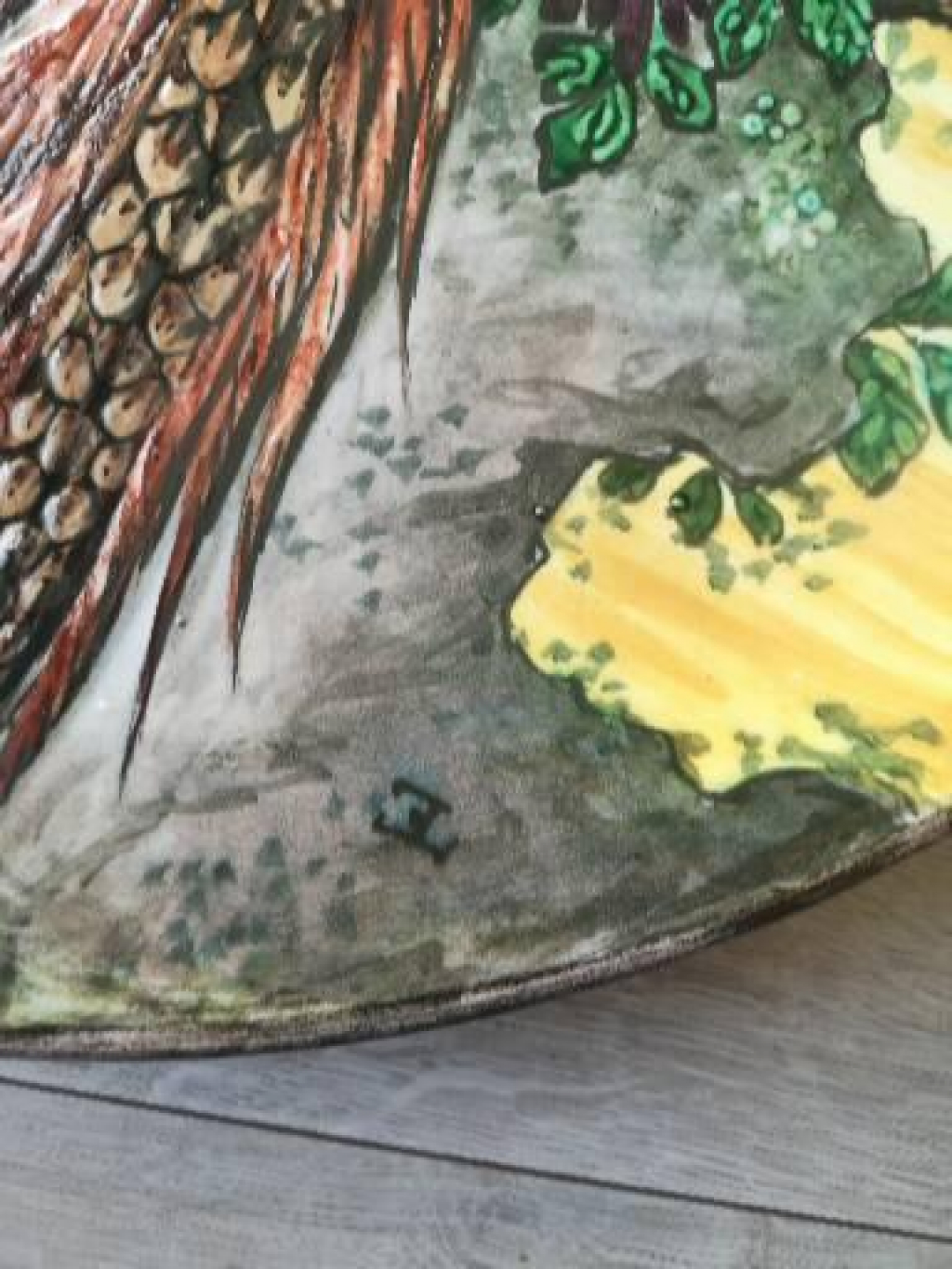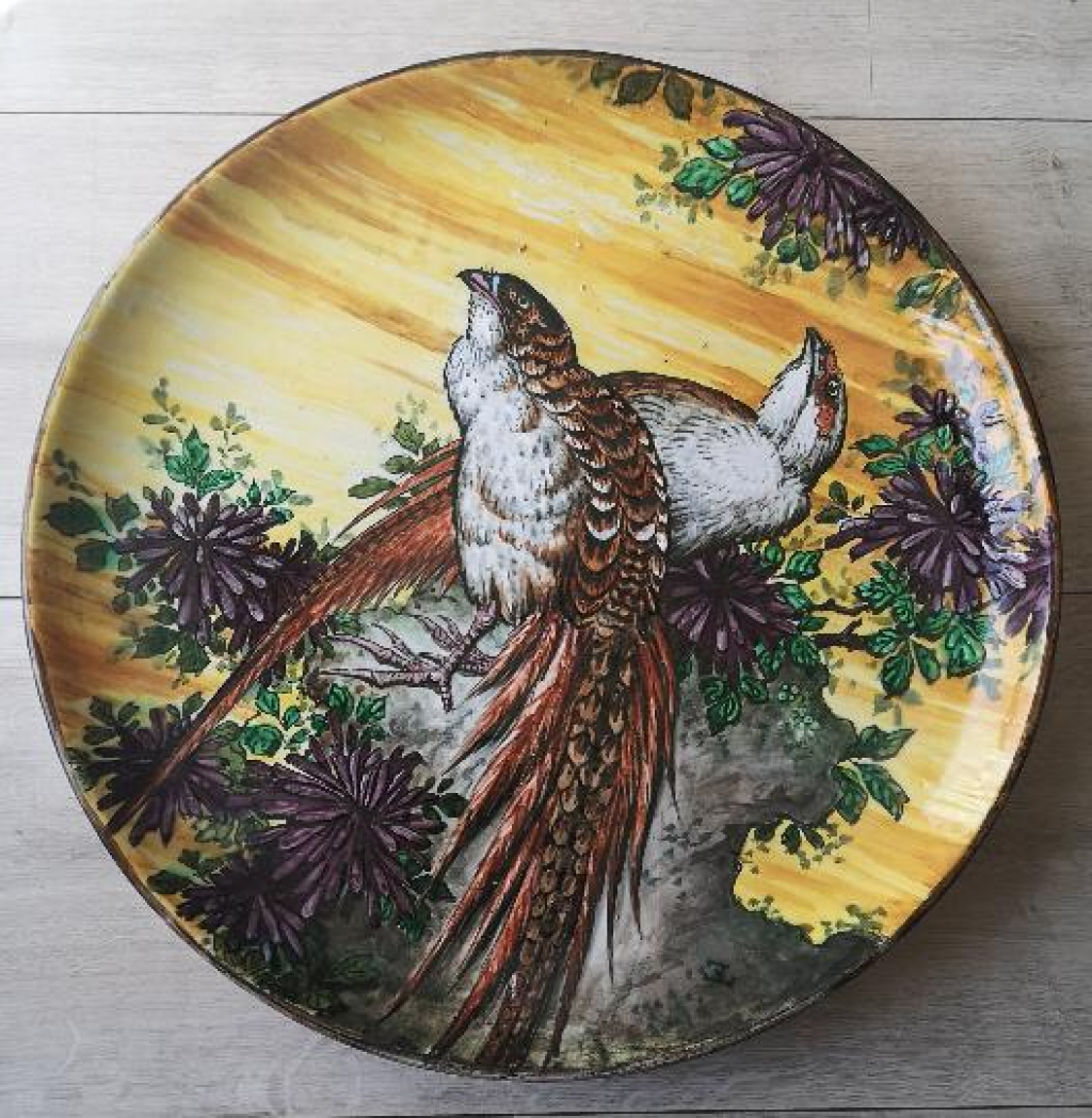 "61,5 cm de diamètre et 7,5 cm de hauteur Belle qualité, avec couleurs vives et en très bon état. 2 petits éclats-manques sur le plumage et qui devra être restauré. Signé à l'arrière et à l'avant"