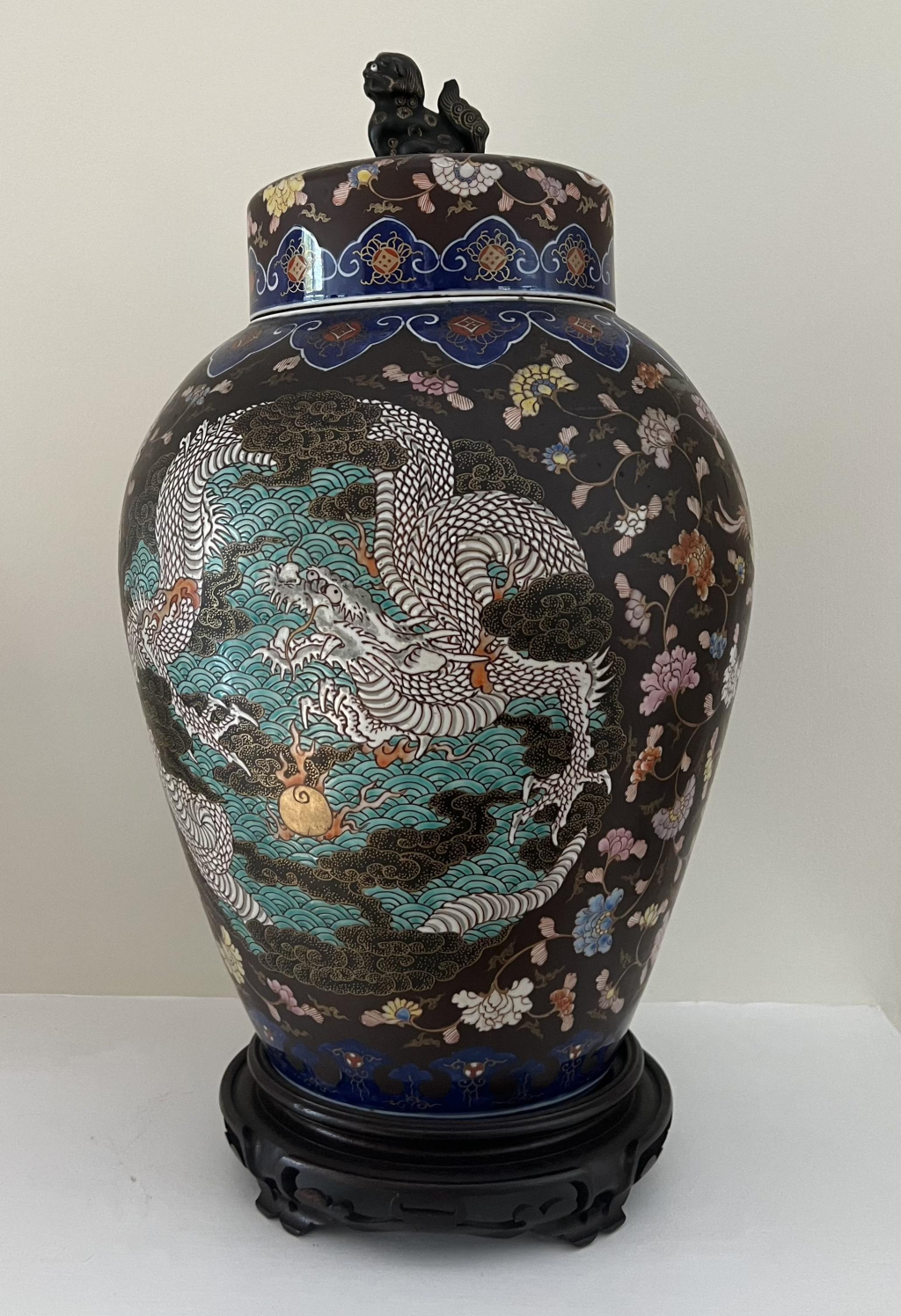 "Grande potiche chinoise avec couvercle en porcelaine émaillée, en parfait état, datant probablement du 19ème siècle. En ma possession depuis le décès de ma grand-mère il y a une dizaine d'années. Cet objet faisait partie des souvenirs rapportés d'Indochine par mes arrière grands parents fin 1913. Mon arrière grand père était sous-officier dans l'armée coloniale et stationné avec sa femme au fort de Bac Ninh, au Nord Est d'Hanoï, au Tonkin (actuel Vietnam). À la naissance de leur fils (mon grand père) en 1912 ils ont reçu de la part de notables Chinois de nombreux cadeaux dont cette potiche."