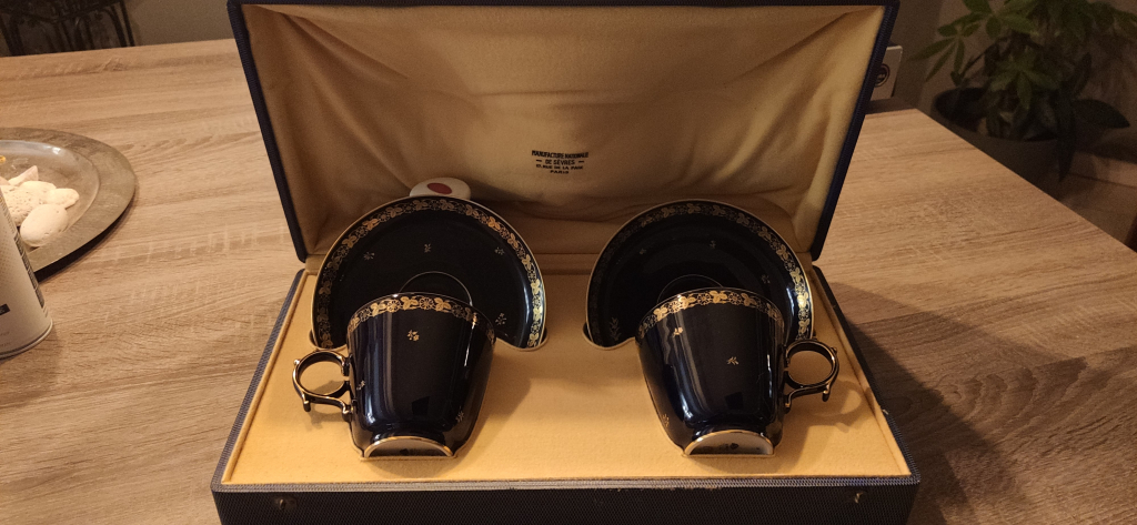 "lot de 2 tasses avec soucoupes, de couleur bleue en provenance de la manufacture de Sèvres. Le tout est est dans sa boite bleue d'origine. Les tasses et soucoupes sont en très bon état, seule la boite est un peu marquée."