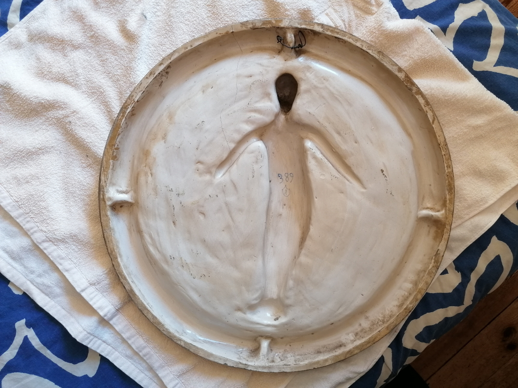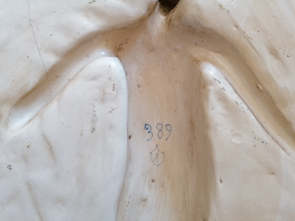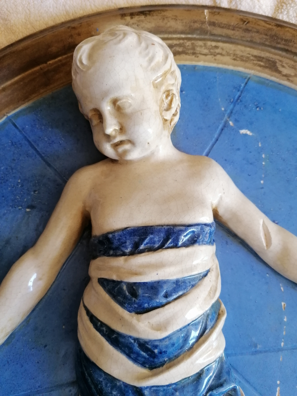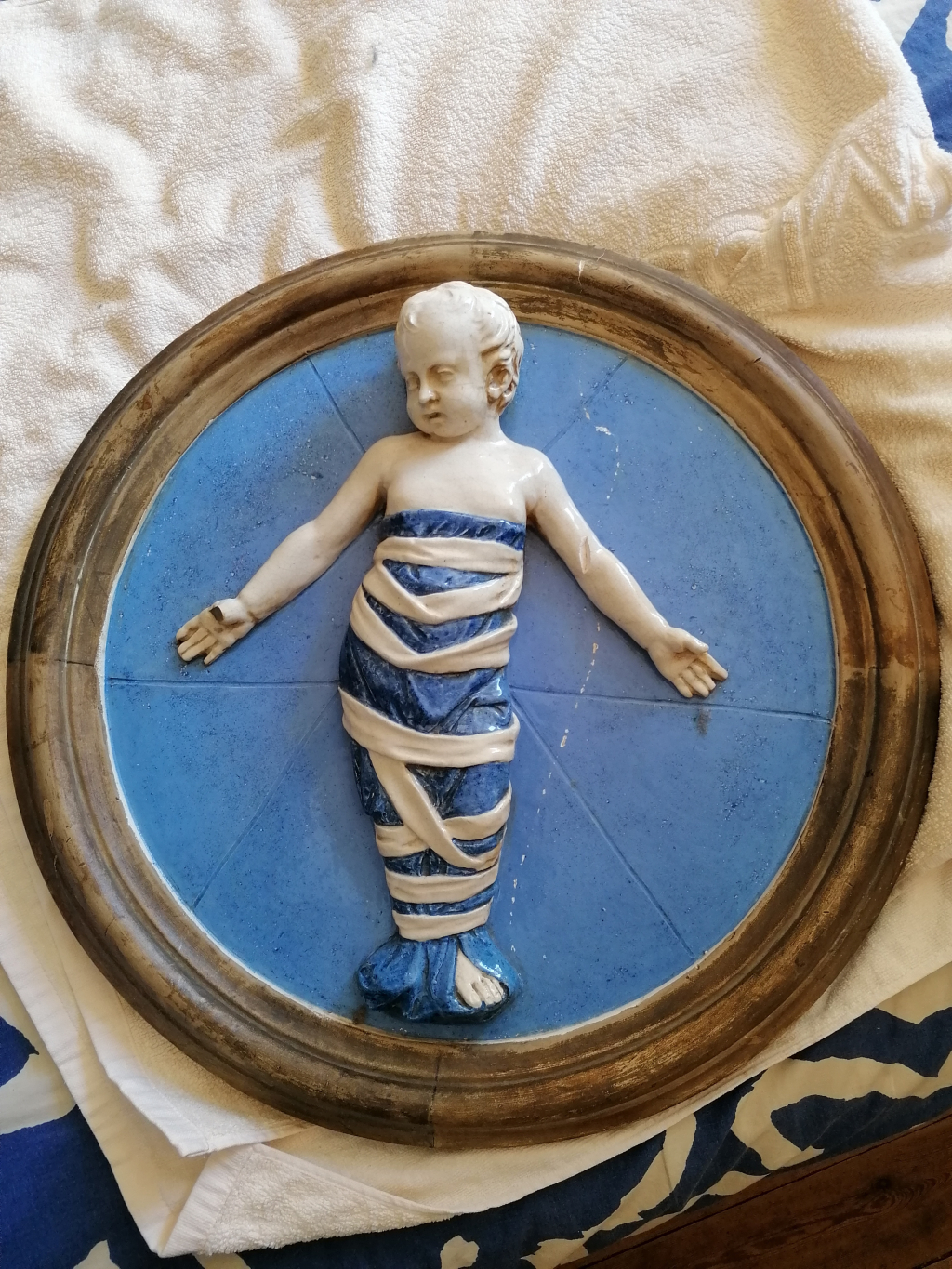 "Enfant emmailloté blanc sur fond bleu faisant penser au Céramiste Andrea Della Robbia."