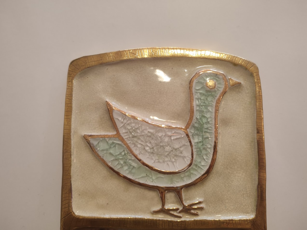 "Miroir céramique modèle oiseau Haut du miroir : fond beige, oiseau bleu pâle et aile blanche Entourage doré Dos : feutre vert foncé Excellent état : aucune tache, comme neuf"