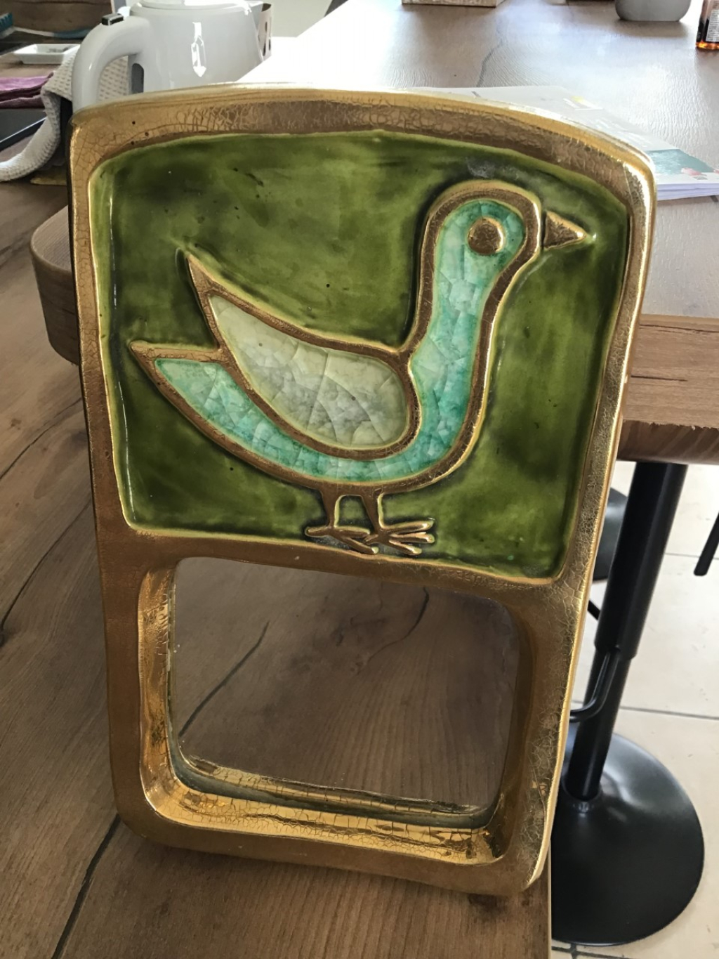 "Mithé Espelt, miroir iconique "Stéle", en terre émaillée, or craquelé et verre cristallisé, modèle créé vers 1965 Condition: Très bon état d'origine, très belle qualité de l'émail et du verre cristallisé. Dimensions: H: 30 cm x L: 18 cm. Juste un petit accroc sur le dos du miroir partie feutre vert"