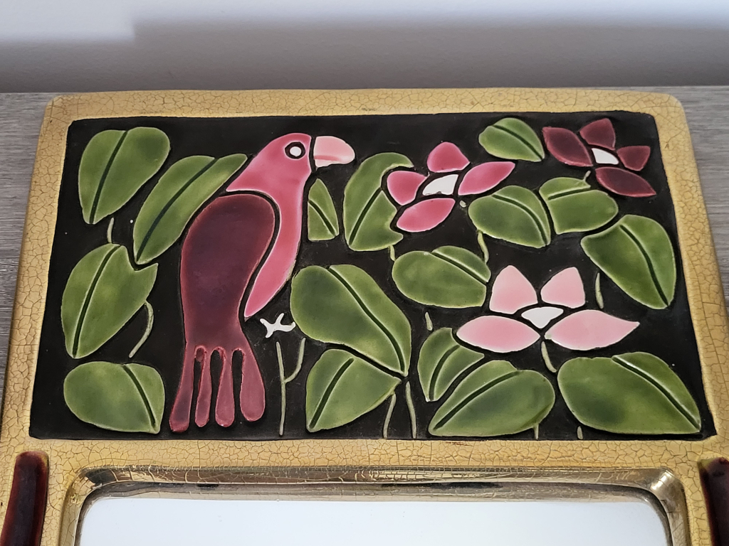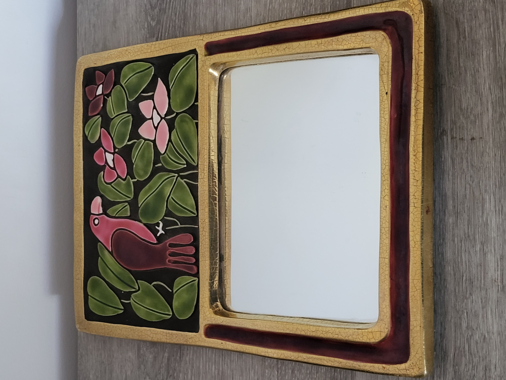 "Miroir mithe espelt. Décor oiseau et contour doré. Dimension 30x22 cm."