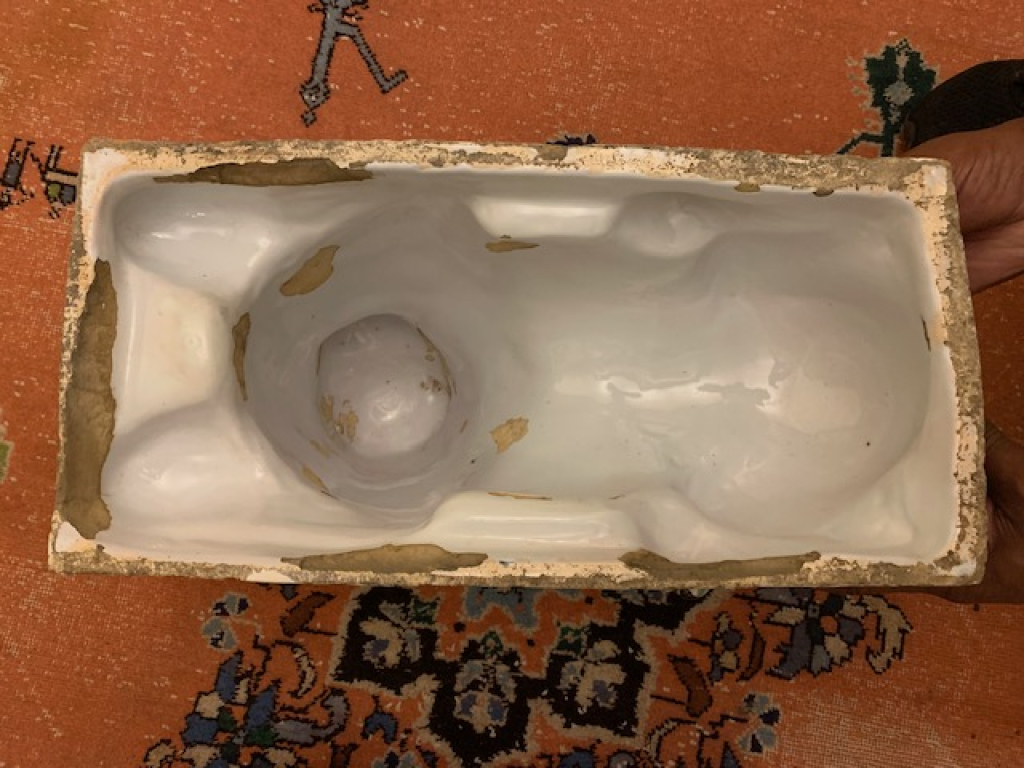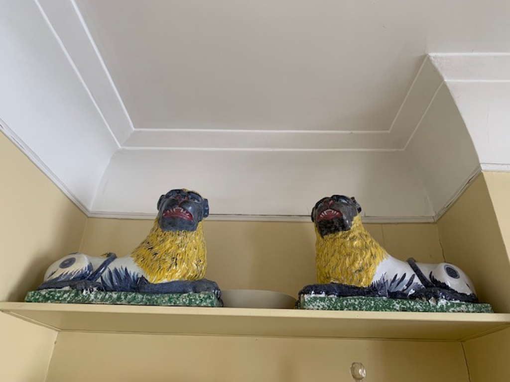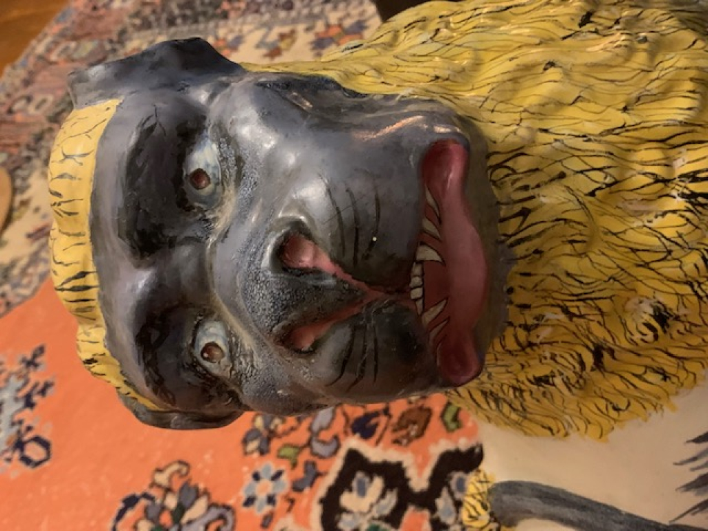 "Bonjour, Je souhaiterai une estimation de ma paire de paire de lions en faïence de Lunéville, époque XVIII ème. Chacun reposant sur un socle rectangulaire vert épongé, couché, les 2 pattes avant allongées, la tête tournée d'un quart de tour et la queue enroulée sur le dos. Leurs pattes, pieds, queues et visages sont peints en gris-bleu et leurs corps blancs ont des taches/marques gris-bleu, avec des crinières jaunes épongées, leurs oreilles et sourcils ont des marques de manganèse, avec des yeux bleus perçants et des bouches rouges. Les couleurs sont restées vives et lumineuses. Dimensions : Longueur : 44, largeur : 21 et hauteur : 36 Cordialement"