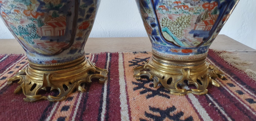 "Paire de vases imari anciens montés sur bronze. Hauteur 61,5 cm Achetés il y à une cinquantaine d'année chez un antiquaire mais je n'ai malheureusement plus la facture, probablement perdue lors d'un déménagement."