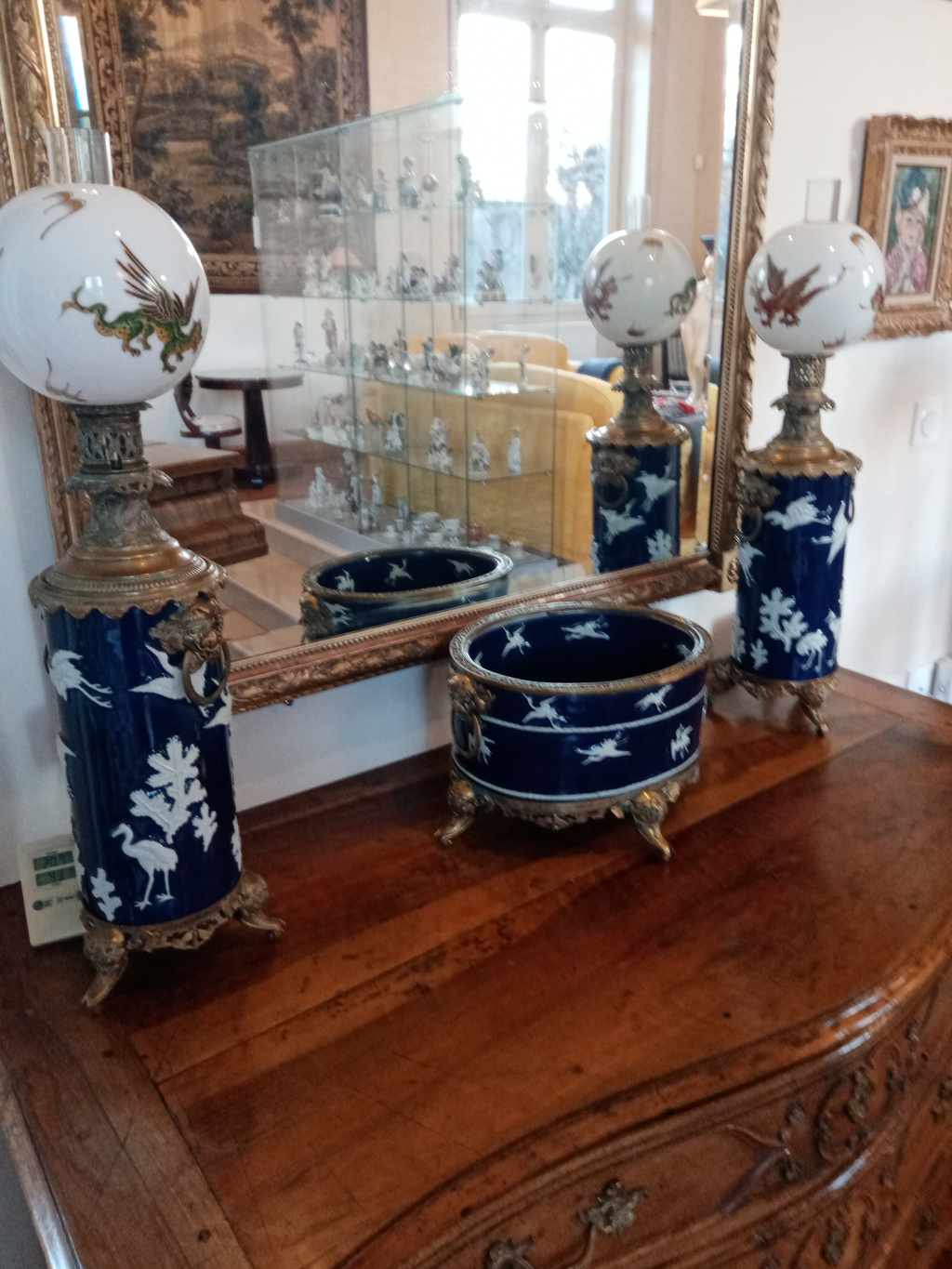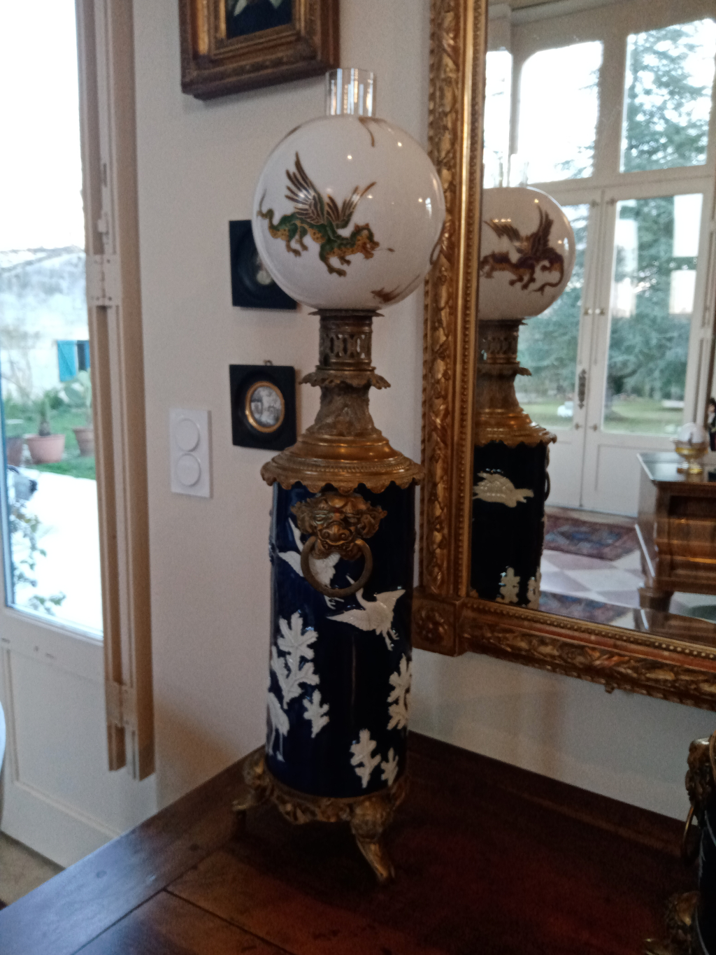 "Serais intéressé pour une estimation de ces 2 lampes à pétrole Chinoise et de sa jardinière ! Merci cordialement"