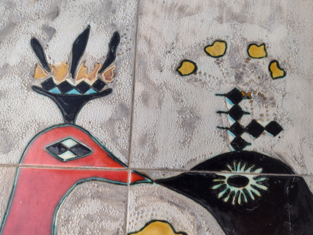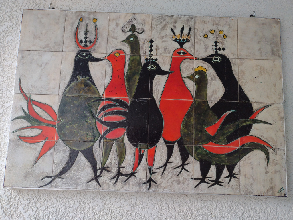 "Panneau mural composé de 24 carreaux de céramique représentant 7 oiseaux dont 2 noirs, 3 gris et 2 rouges. Signature en bas à droite "CJ" ? et date "70". Quel est l'artiste ? Quelle valeur ?"