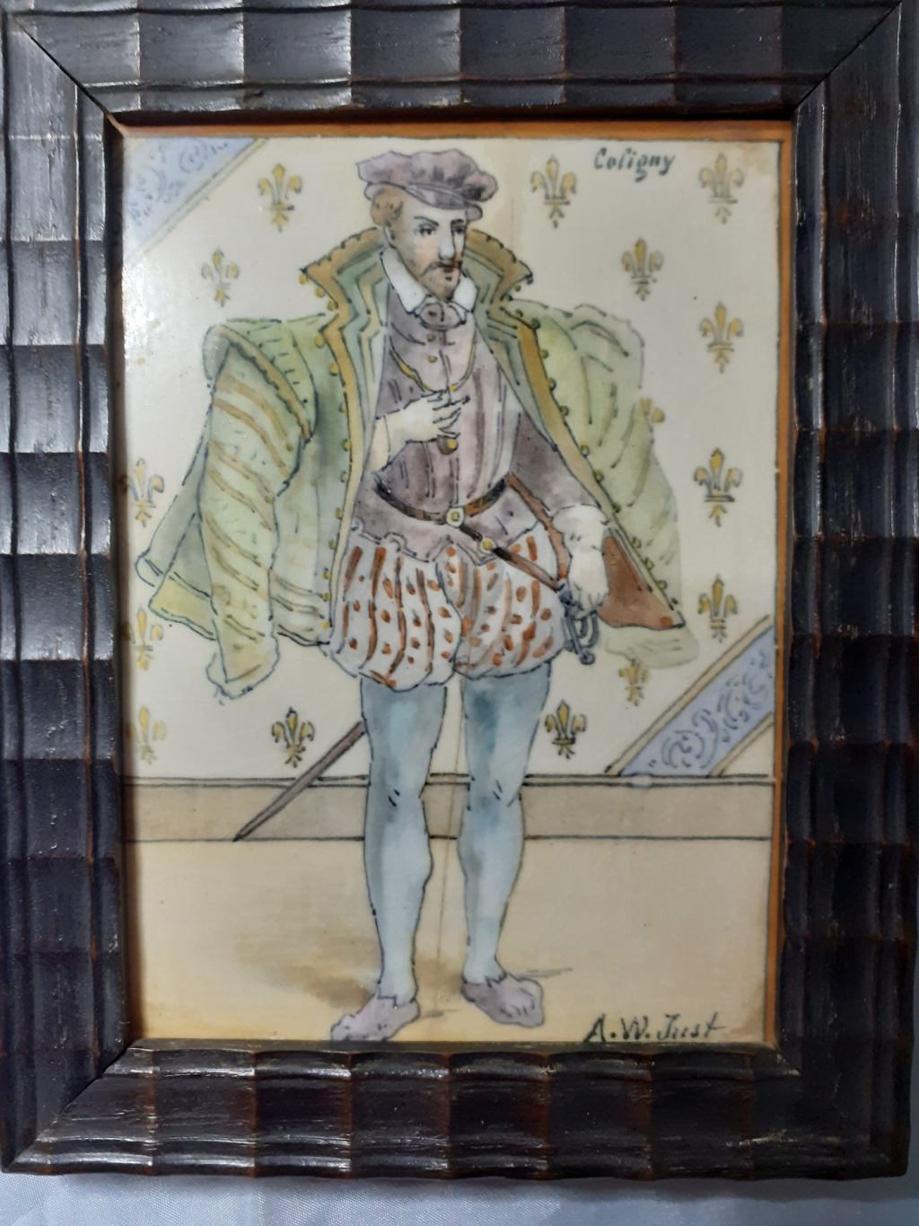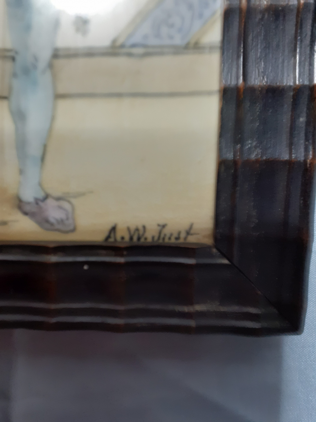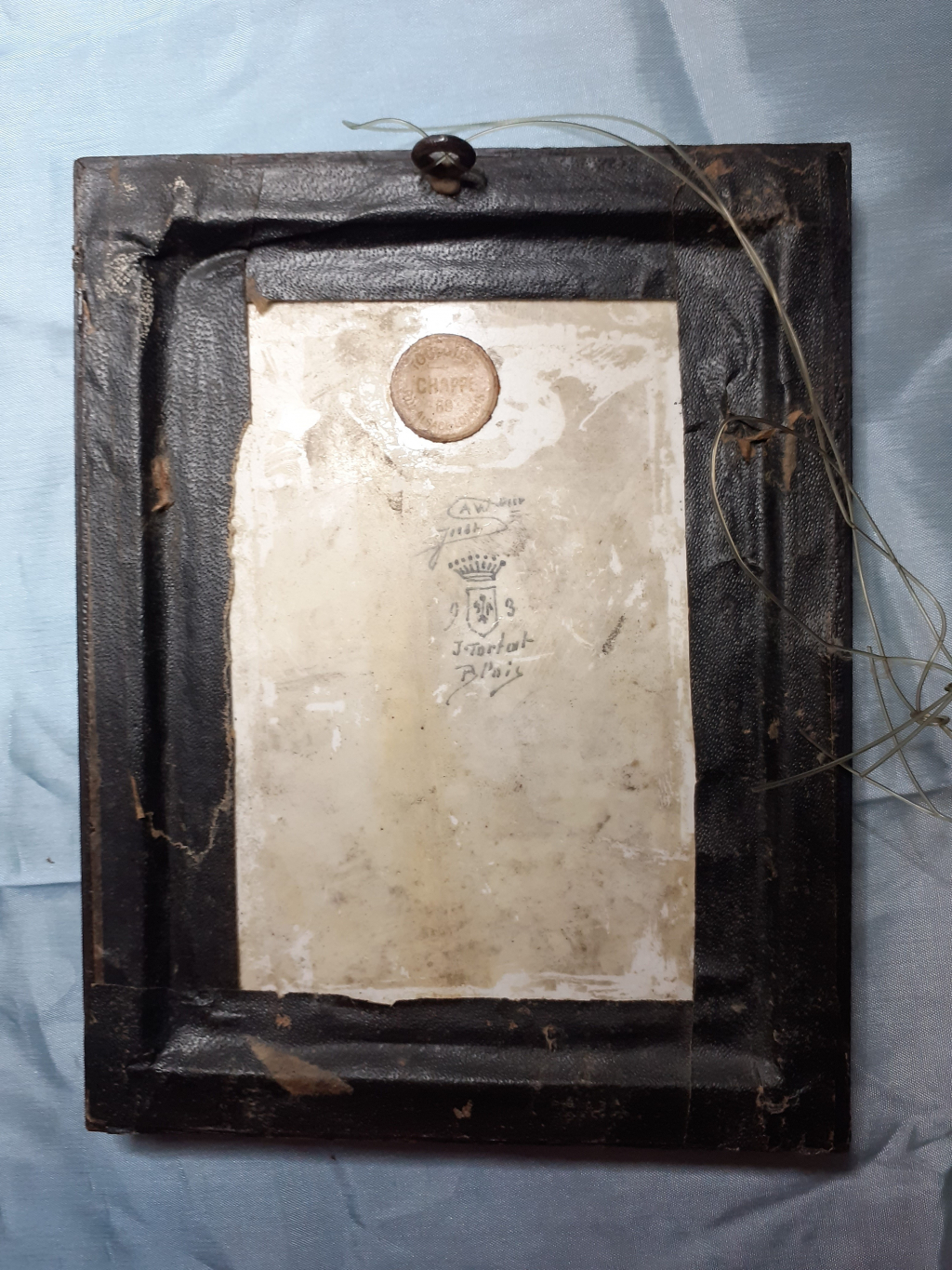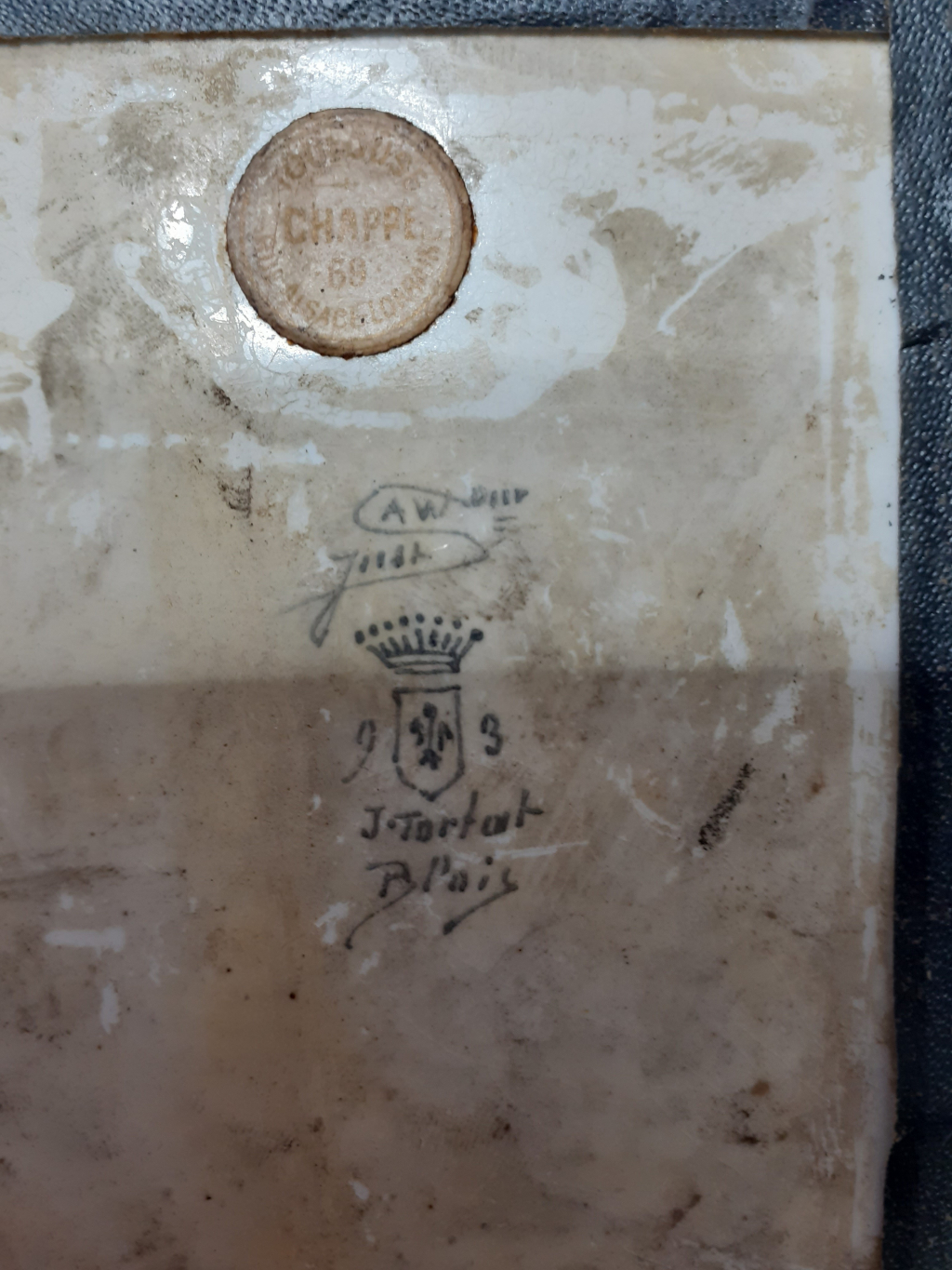 "bonjour , il s’agit d'un cadre de dimensions 12 cm x 15 cm pour le cadre , la céramique est signée J. Tortat blois , A.W.Just , à noter un micro fissure sur la partie face , pas très visible au revers , voir photos. vous en remerciant par avance , bien cordialement."