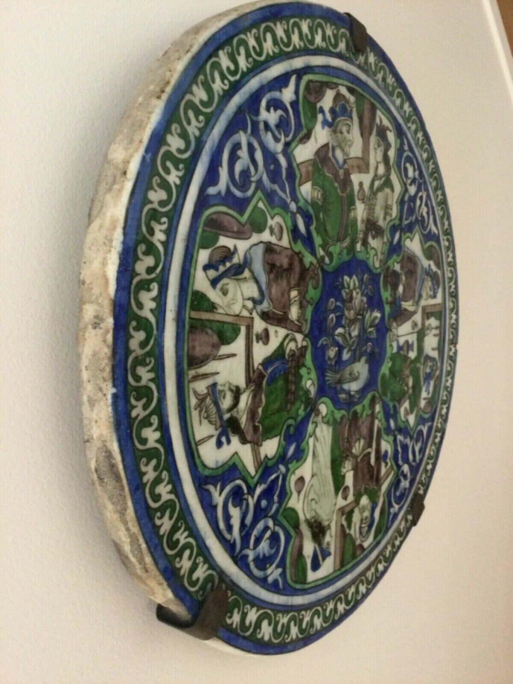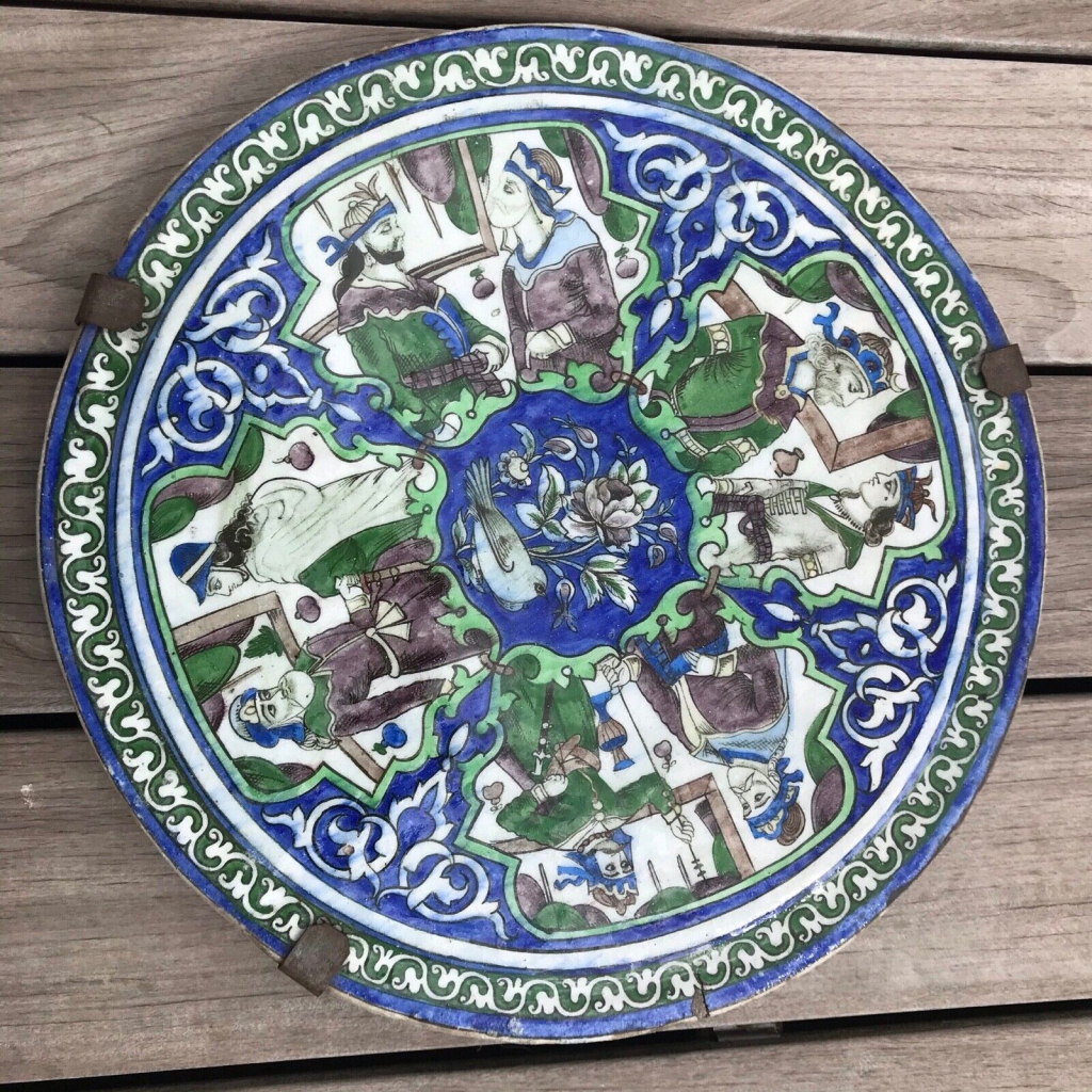 "Ancienne plaque persane en faïence émaillée datant de la dynastie kadjar… Le diamètre est de 42cm L’épaisseur est de 2,7cm Le poids est de 6,2kg"