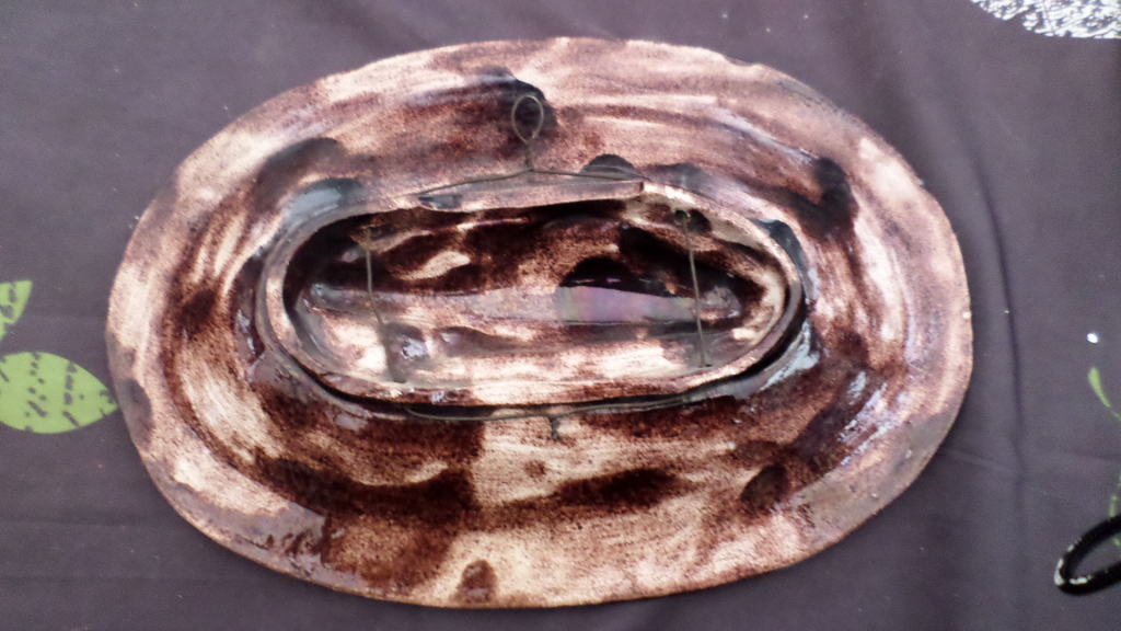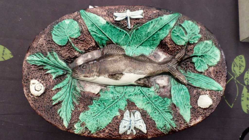 "plat poisson ancien de style Palissy ne connais pas l époque en très bon état les mesures sont 40cm de long sur 27cm de large et environ 4cm d épaisseur pourriez vous me donner votre avis cordialement"