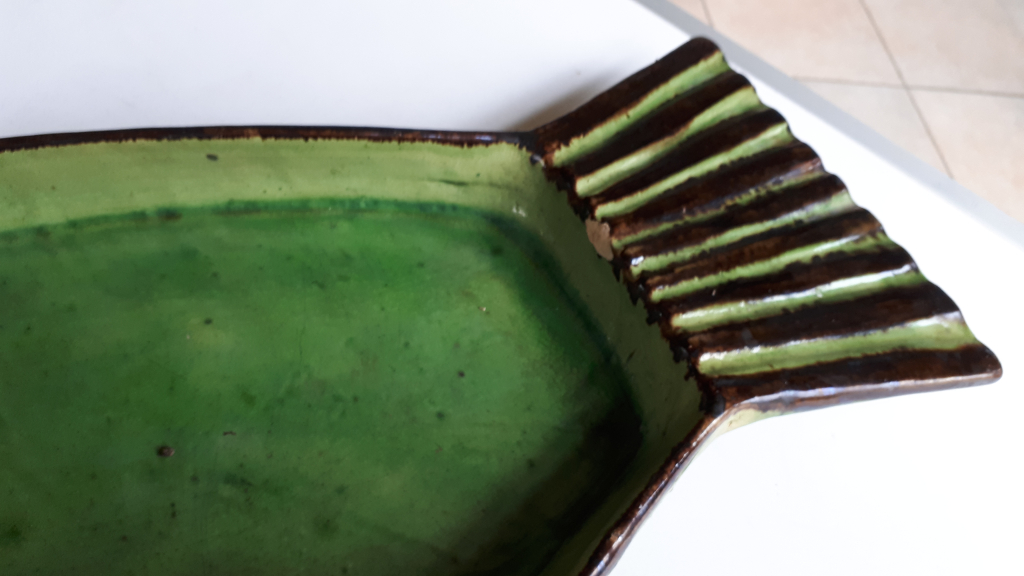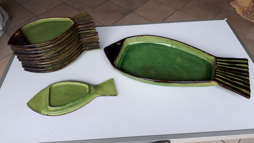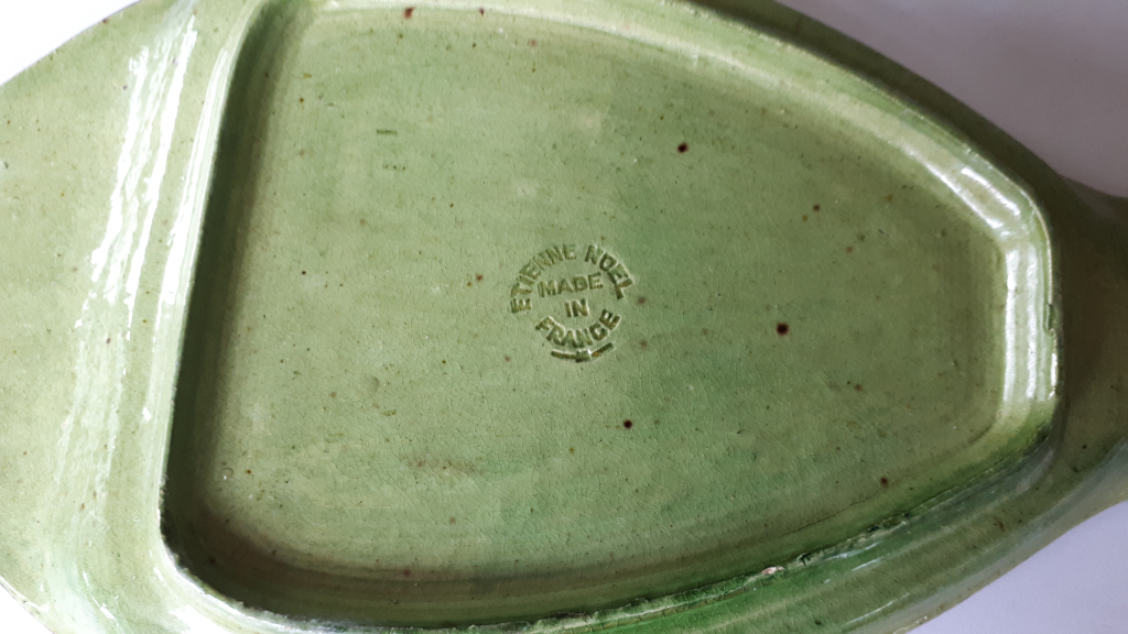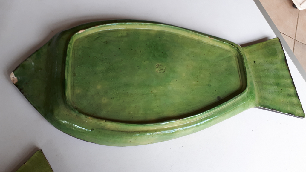 "Service à poisson ETIENNE NOEL composé de 11 assiettes (31cm x 15xm) et 1 plat à poisson (56cm x 25cm) Il est en très bon état hormis 2 minis éclats sur assiettes et le plat est ébréché au niveau de la queue et dessous"