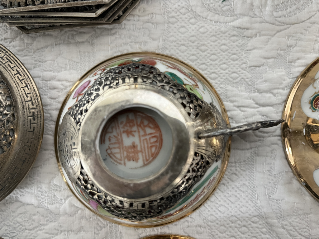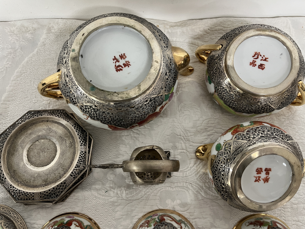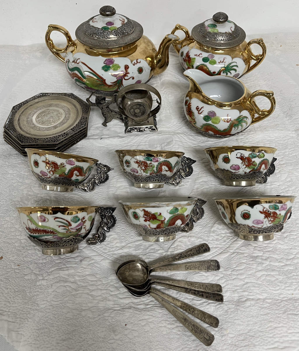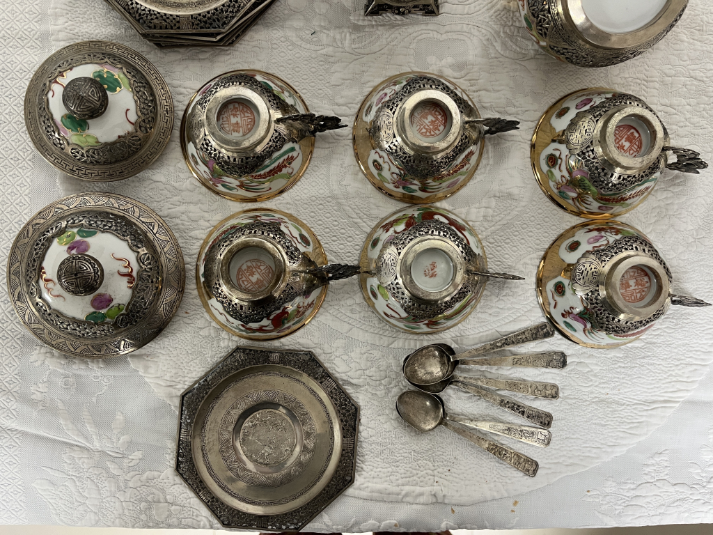 "Service à thé rapporté du Vietnam par mon grand-père en 1950 environ Jamais utilisé retrouvé intact dans l'armoire pas nettoyé pas servi - juste une soudure d'une anse d'une tasse à resoudrer 6 pièces de chaque : sous tasses, tasses, cuillères 1 pot à lait, un sucrier et une théière + 1 porte thé"